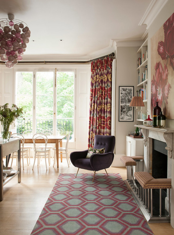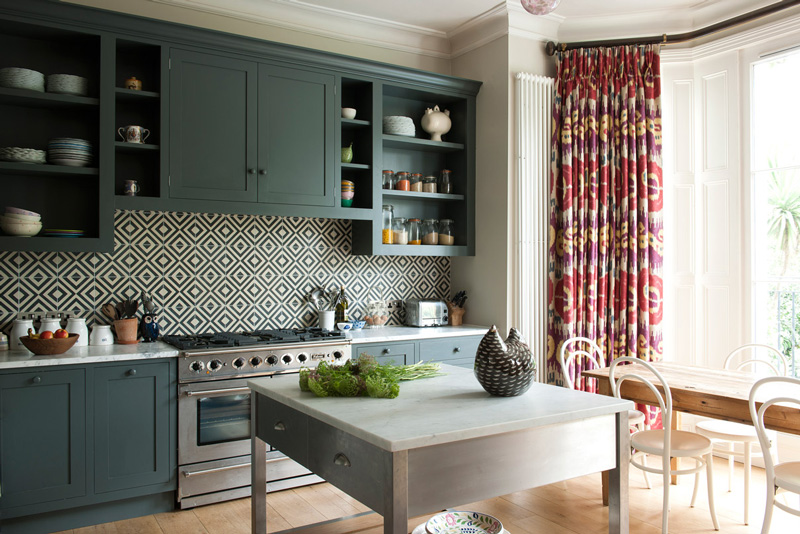 Fresh colours, patterns and textures add flair to these spaces created by another British designer Flora Soames. Casual chic with a great energy. I want to hang out and drink coffee in this kitchen, complete with fireplace. (Anyone else desperately in love with a fireplace in a kitchen?)