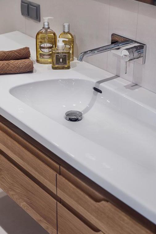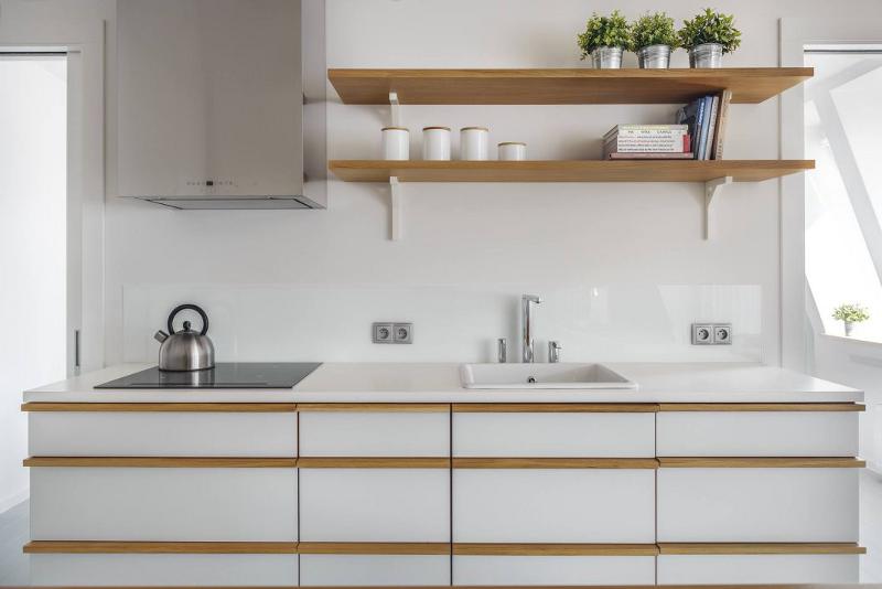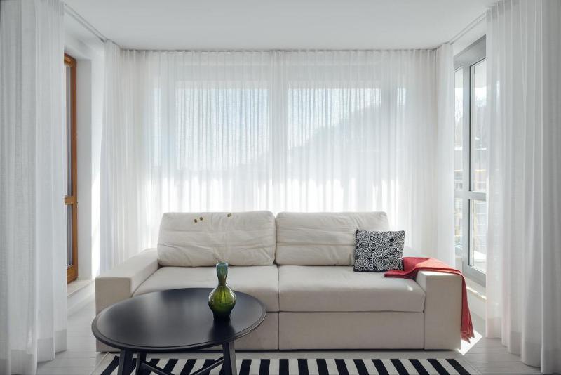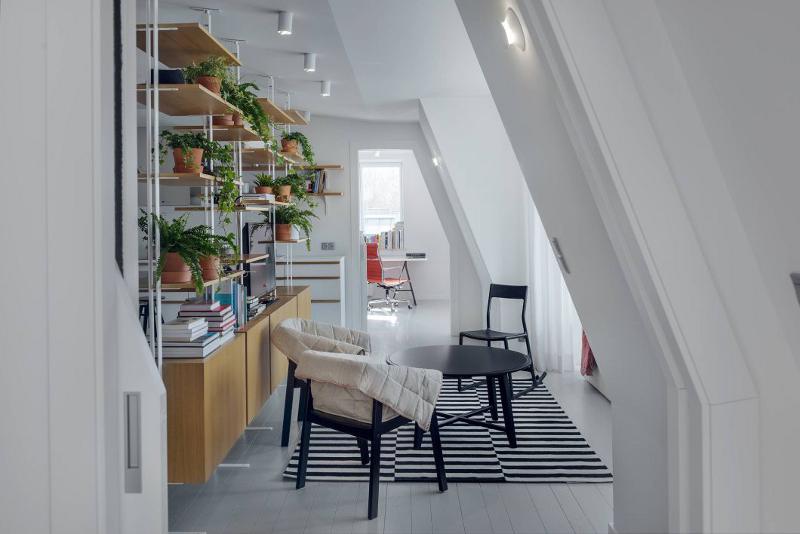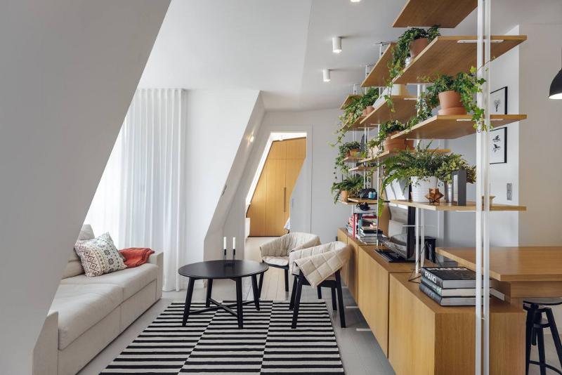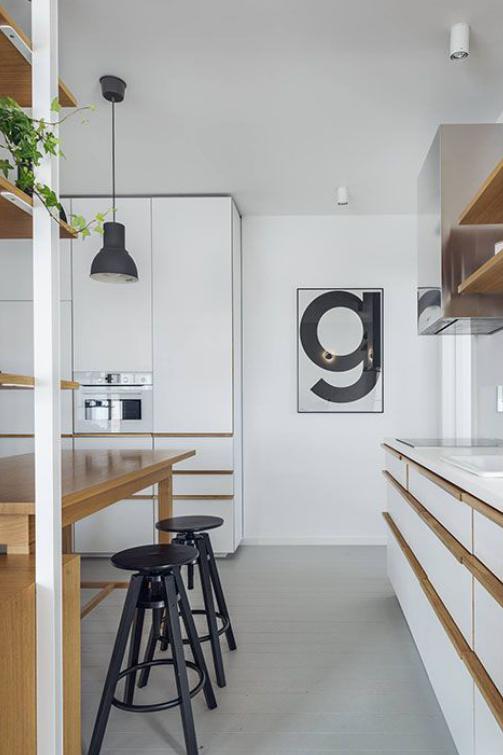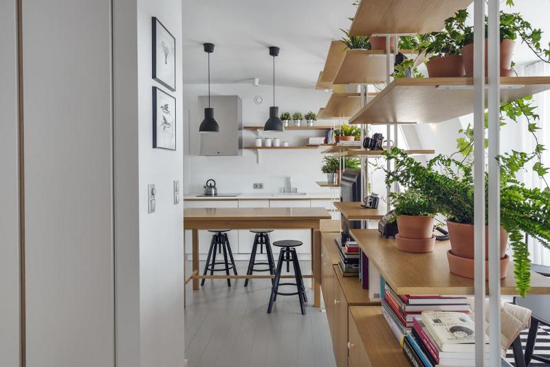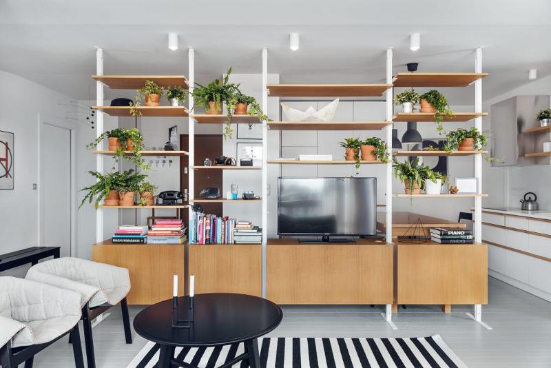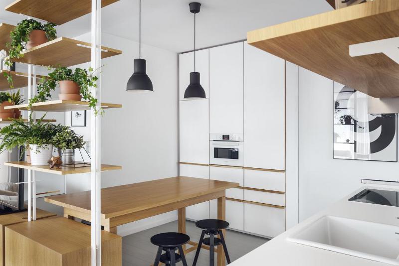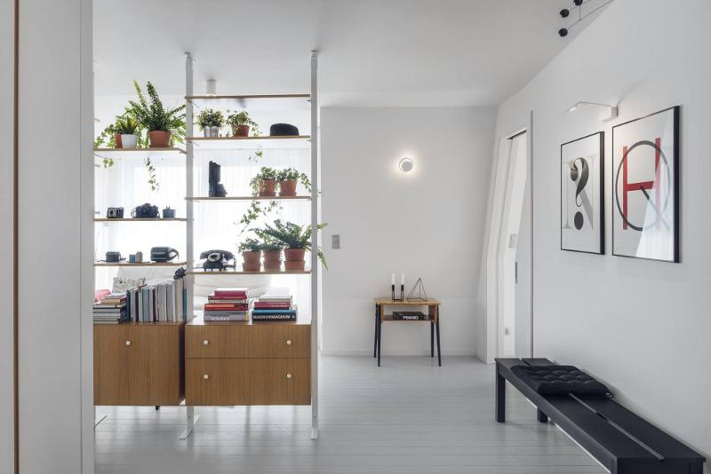 I think what I love most about this 70 m2 apartment in Sopot, Poland is its freshness. The light, bright rooms, all the white and that standout shelving system/room divider with all its beautiful greenery. Such a clever way to divide the space. Let’s start at the front door. Yes, yes, walk further in, turn and then you start to smile. Yes. See what I mean. Aquarius by LOFT, a designer workshop founded by Magdalena Adamus.