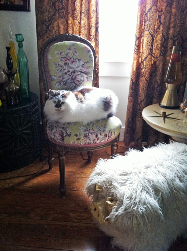 I took this photo yesterday morning. It is amazing to see former feral Bernie be so comfortable that I can go right up to him and snap a bunch of photos (I got much closer after this one) and he could not care less. He is in a corner of the dining room snoozing on my Plycraft chair that I unfortunately feel the need to cover with a faux sheepskin because the cats take over all of my lounge chairs. And a Daff Design vintage radio converted into a Bluetooth speaker is to the right, used every night at dinner time so hubby and I don’t have to listen to each other chew. 🙂