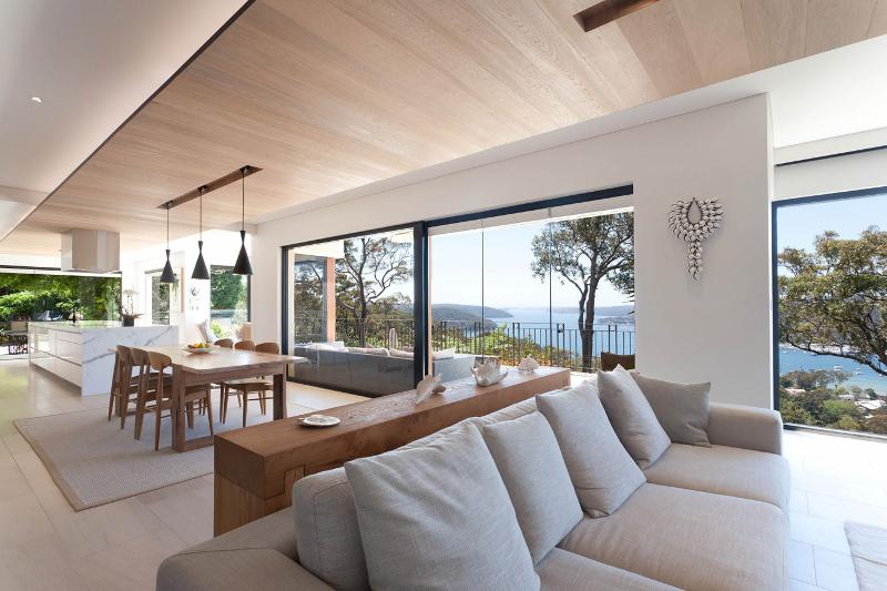 Open plan living united by a line of timber highlighting the fireplace and rising up and over the dining room and kitchen. Warming a white, open space, adding texture, defining spaces, grounding and balancing. Renovations by Sydney-based Quattro Interiors.