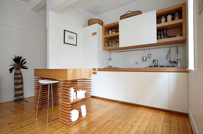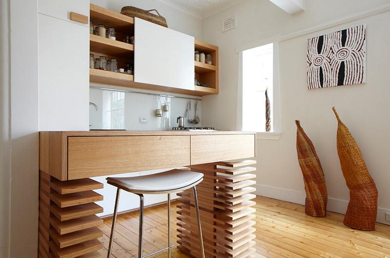 Love this simple white and wood kitchen by Sydney-based architect Tash Clark. Small but stylish. More kitchen as furniture than island bench. I’d possibly lengthen the bench or perhaps it’s the weirdly distorted images that have me wanting just a bit more. The inclusion of Aboriginal art pieces just seals the deal for me.