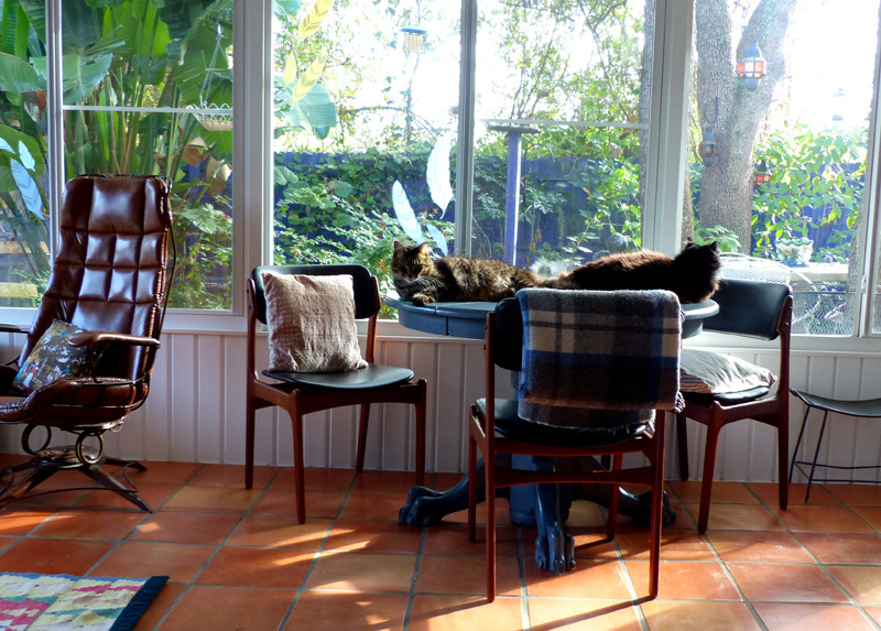 First two are of our newest addition to the family: Mr. Meatball. Of origin unknown…breed? part unicorn, part manatee, part potbelly pup, and the remainder is most likely a grandpa doggy. Full of love and bad hips…and lumps…and allergies. And we love him to the moon and back. He has to have a set up that allows him to get onto chairs and coffee tables…hence the ton of ottomans around his areas. Doesn’t look glamorous but we don’t mind! Last shot are Farrah Fawcett (aka Fat Bastard…like in the Austin Powers movie, not as an insult) and her son, Sydney (grey kitty). The are in the same sun room as the pup.