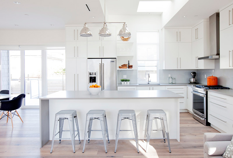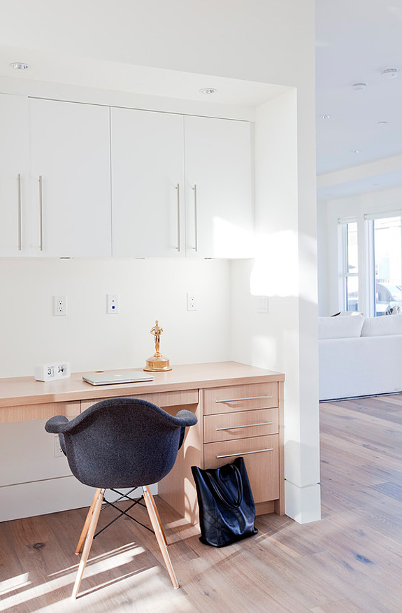 White, grey, wood, and brick. Beautiful! I wonder why the outlets are so high up the wall at the desk niche?