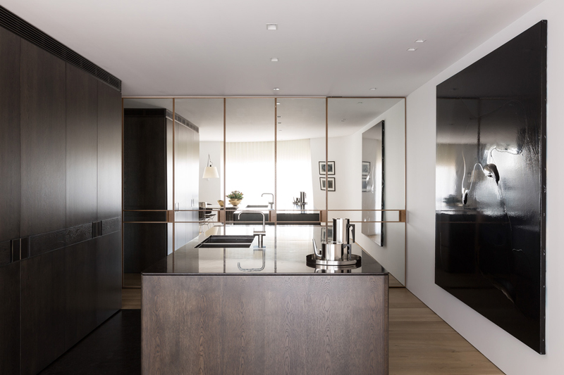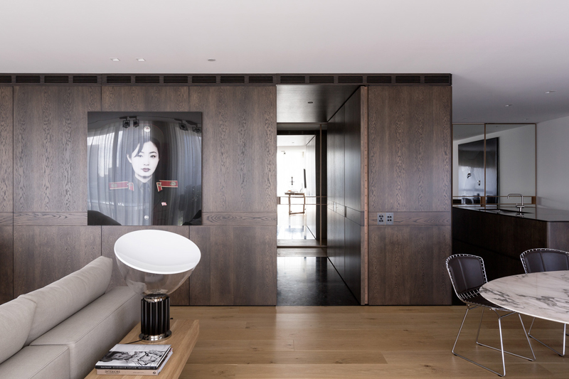 A small apartment in Milan, Italy uses a clever visual trick to increase the sense of space and define zones within its otherwise open plan. Vertical pieces of larch and two black painted plywood panels delineate the rooms allowing the eye to travel easily throughout the space. Clever interior design by the Milanese studio TOMOarchitects.