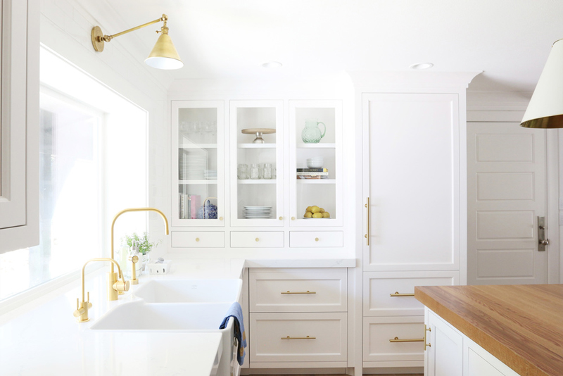 Yet another brilliant remodel by Studio McGee. This one I am completely envious of. This kitchen is so bright and the timeless and the attention to detail is spot on. Brass accents bring it to another level of fabulousness. I am envious of the space – to fit an island with bar stools, a little entryway to store shoes and coats, a built-in desk area and laundry! OMG! My kitchen is the size of the average bathroom. Yes, this kitchen would be a dream come true.