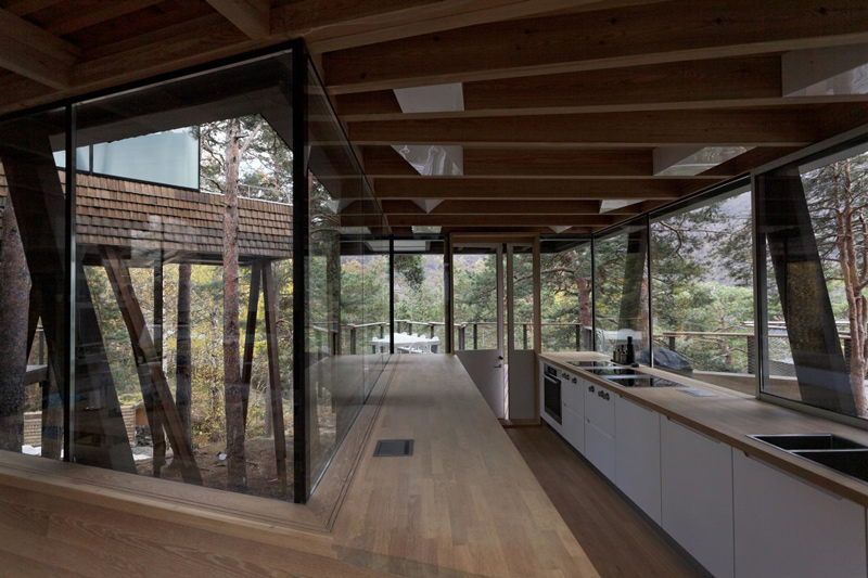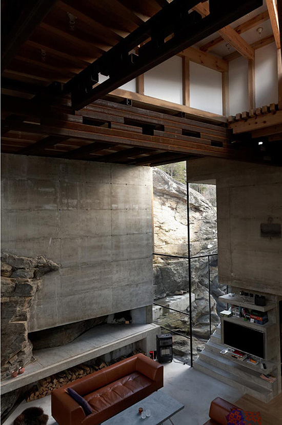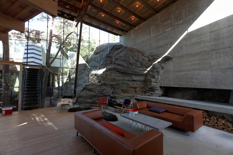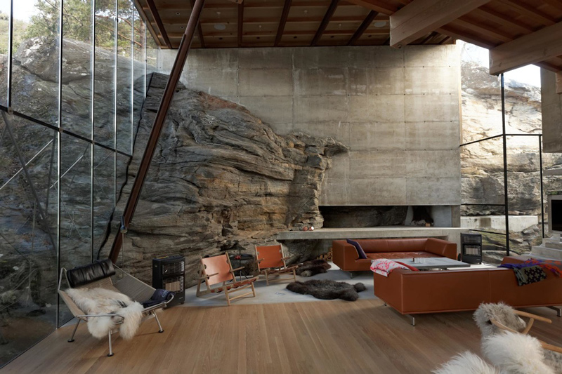 The house is spectacular with it’s intertwined spaces built around a granite face which becomes a sensational piece of art in the living room. The height and depth of views of the fjords and the massive timbers holding up this delicately fitted structure make it appear like a childhood dream of luxurious private tree house that you’ve always longed for.