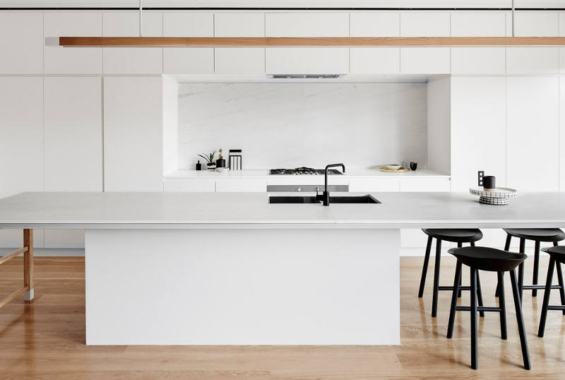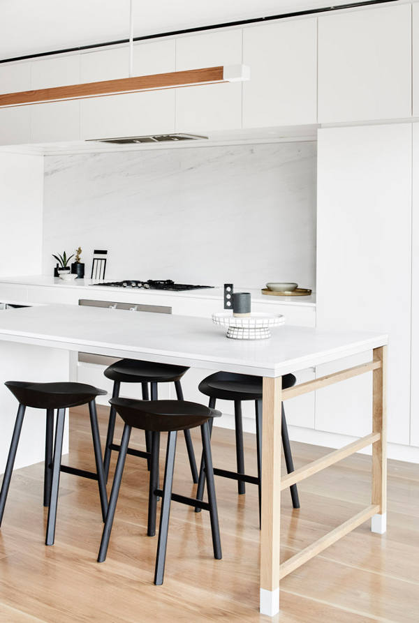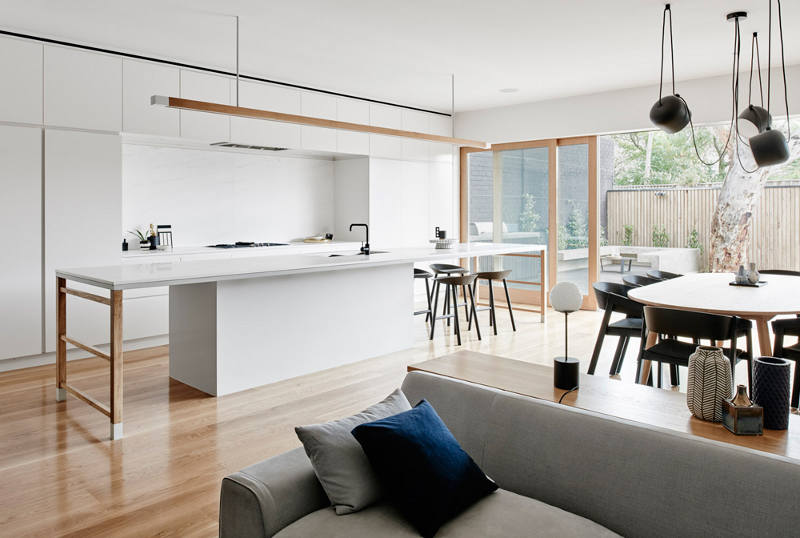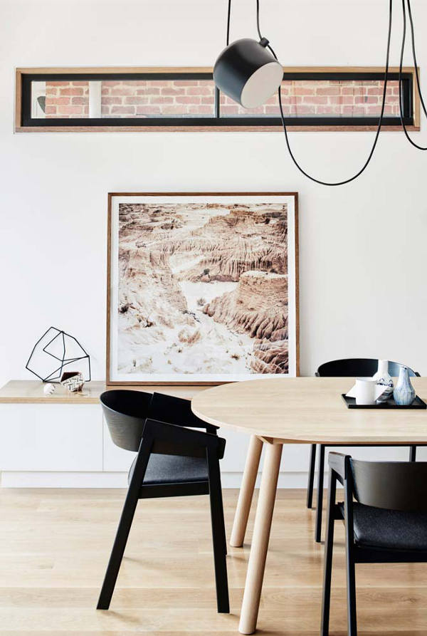 It’s what Australian architects seem to do so well. The extension, the addition to an old house that opens the living areas up and out. House facades and streetscapes are maintained while out the back clever two storey additions fulfil family needs for modern living. Love the monochromatic palette of this home warmed by the rich wood accents. Contemporary, clean lined, sleek and stylish (although I’m a little worried that, at least here in Australia, the Flos Lighting Aim Lamps are in danger of going the way of Tom Dixon’s Beat Lights and become ubiquitous). Elwood House by Melbourne-based Architecture and Interior Design practice Therefore Studio.
