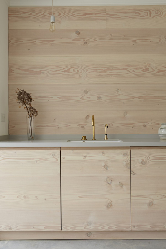 Love how they use the same wood on the wall and the cabinetry. Stunning.