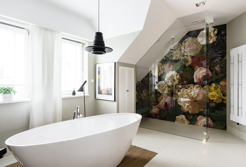 Gorgeous, I especially love the the shower wall mosaic! Not sure that floor lamp by the tub is such a good idea, though.