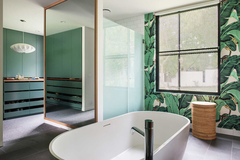 I love that bathroom/dressing room area. I've been mulling over the banana leaf wallpaper for one of my bathrooms & this looks great. The outside looks unfinished to me and the metal fencing on the lefthand side looks fairly harsh.