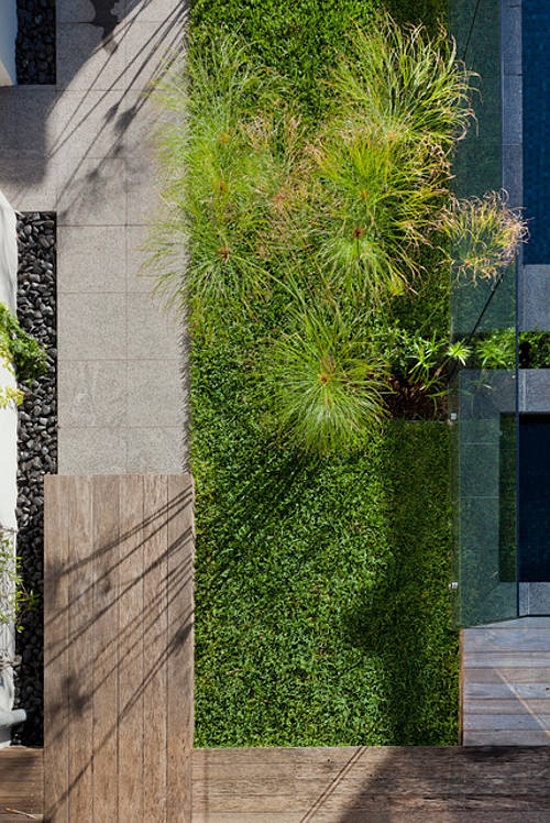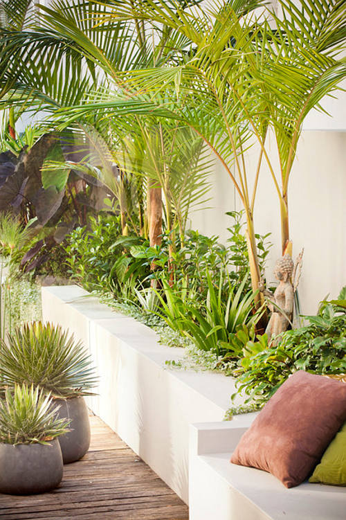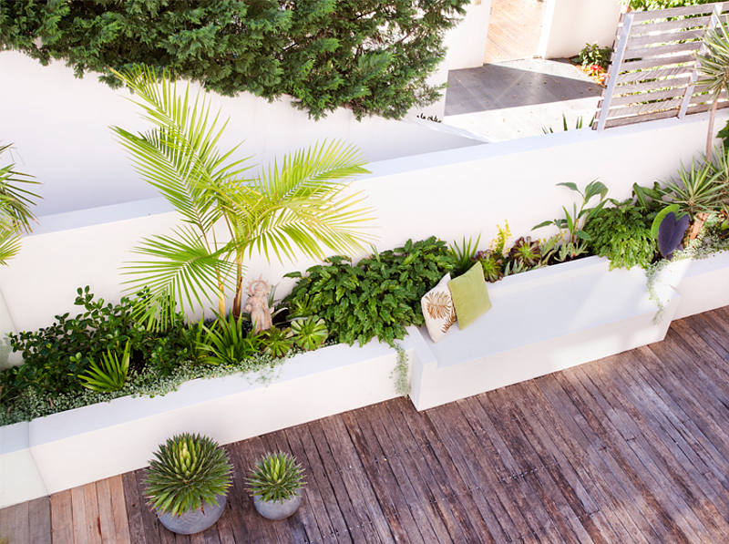 Those low walls around the plantings are brilliant for providing extra seating if you're having a party. Or places to pose a glass. And no clutter or need to stock furniture off season.