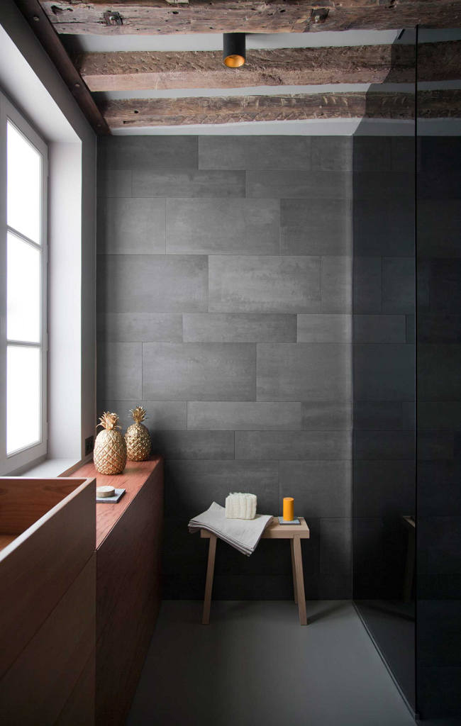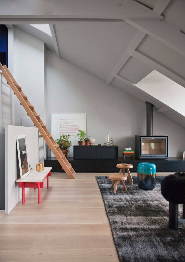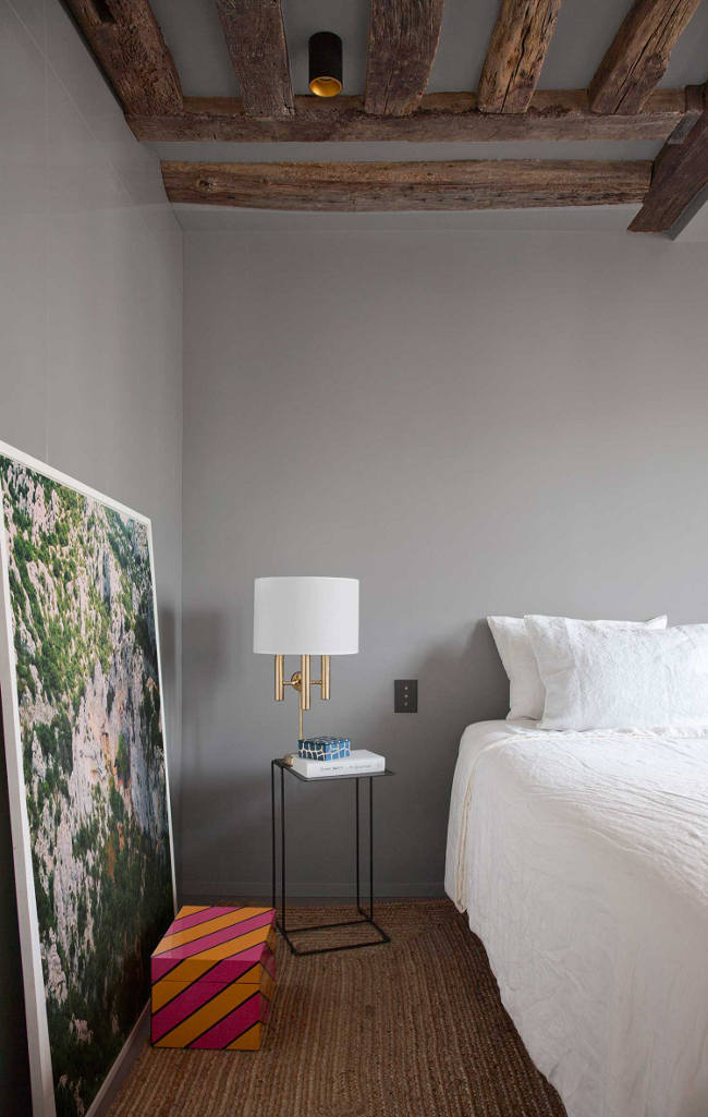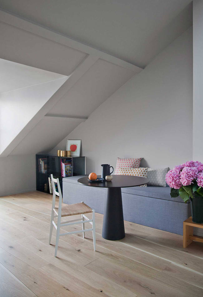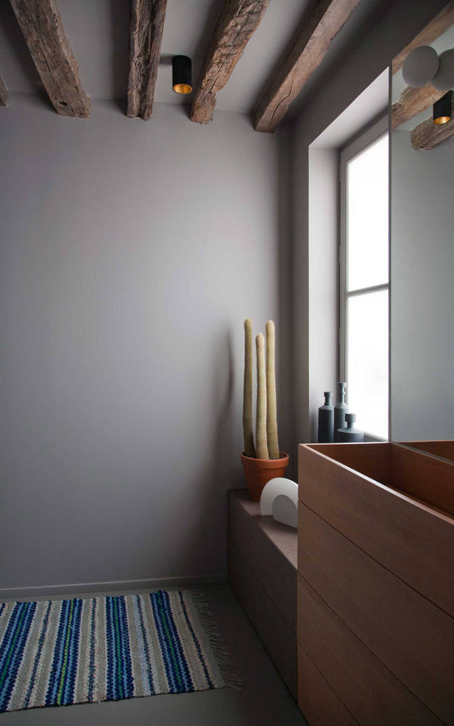 Two floors of French fabulousness in this apartment by Paris design duo RMGB. On the upper level are kitchen, dining and living areas with a mezzanine reached by a ladder, all tucked into the building’s eaves. Downstairs bedroom and bathroom with exposed beams. Minimal, modern lines with custom joinery and beautiful oak floors, all united with the perfect shade of grey.