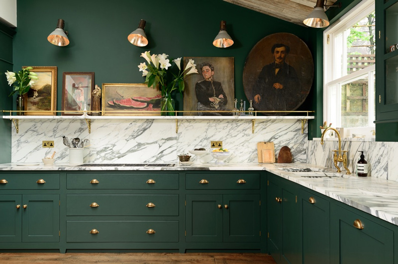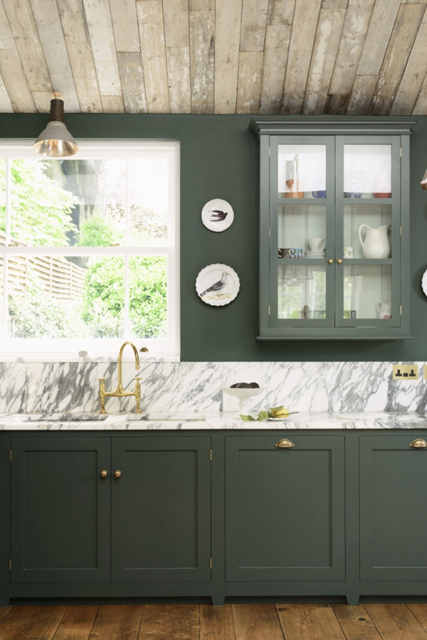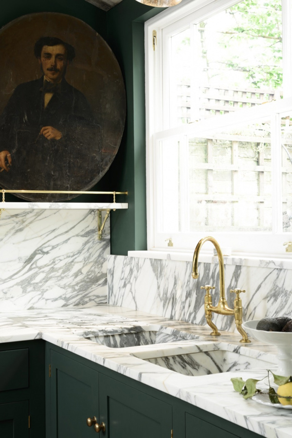 what a wonderful kitchen, i love the contrast between the green cabinets with the top and splashback in White marble. Think that marble looks like an italian quality marble called Calacatta, stunning.