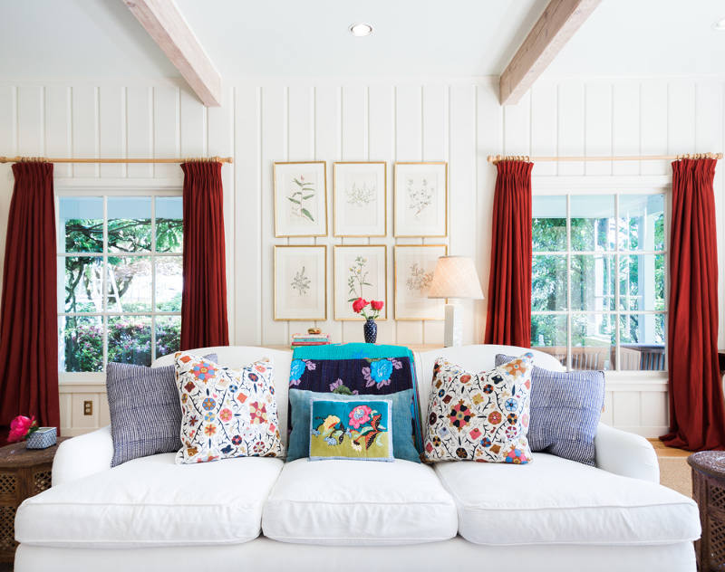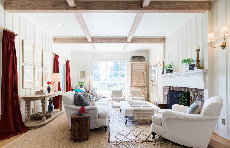 Usually I find red to be cheesy, but it looks great here. The dining room rug seems too small–people will catch the chair on it when they pull in/out.
