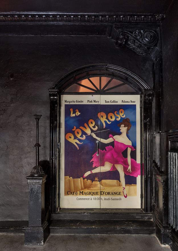 I absolutely love everything about this 60 m2 bar in Kiev, Ukraine called Pink Room designed by Circle Line Interiors. From the colour scheme and the glamorous vibe to how it operates. Bar is situated in a historic part of building of old cinema “Kiev” in the centre of the city. Owners of the place wanted to create something that differs from the rest of speakeasy bars which already exist in the city. It was supposed to become the secret place for all cool underground music lovers, for those who appreciate art of cocktail culture, of silent cinema performances and for those who appreciate french style of the beginning of 20th century. Pink room is placed at an old stairway of the cinema, which was closed for the last 10 years. The entrance is behind the replica of Jules Chéret’s poster “Exposition universelle de 1889 : Le pays des fées”. Instead of Paris our designers painted Kiev’s historic Sofia square. To enter speakeasy one has to know secret code on a door, which can be obtained only from the owner of Pink Room. The overall size of the place is 60 square meters.