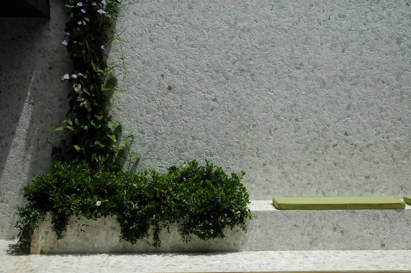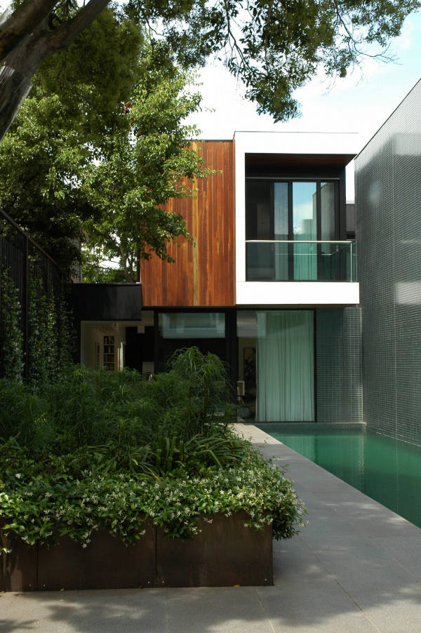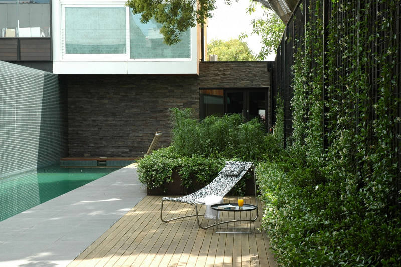 A small but stylish garden in inner city Melbourne by Eckersley Garden Architecture. Pool, lush creepers, old Ash tree and privacy define the rear space while a simpler enclosed courtyard with over-scaled stone walls and limited planting makes the perfect little sun trap.