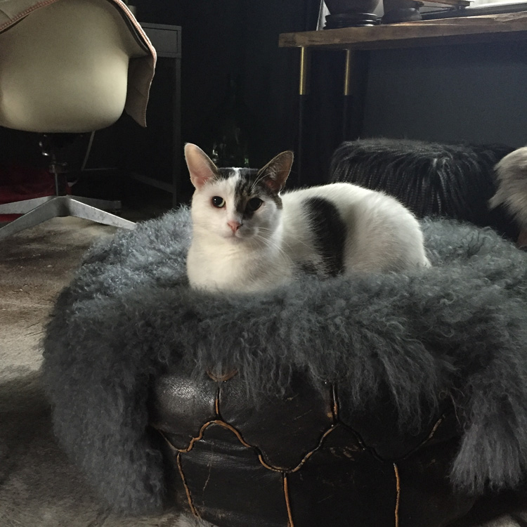 And a couple from me, featuring Felix on and Bernie under my Plycraft chair and Frankie on my vintage leather pouffe.
