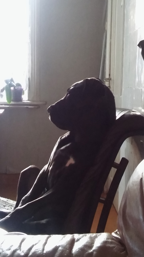 This is Ram, 5 months old Great Dane from Estonia, Tartu, It is misty rainy monday morning, and he is thinking about life on his chair 🙂