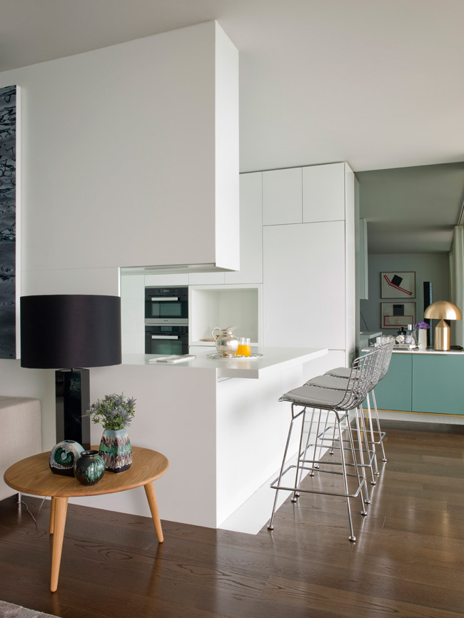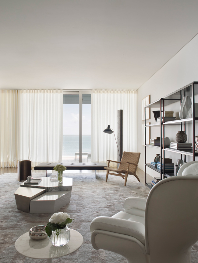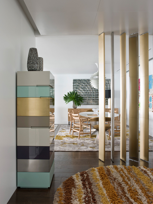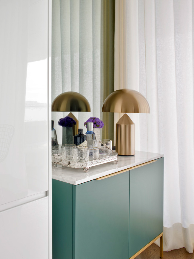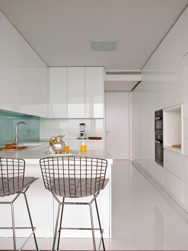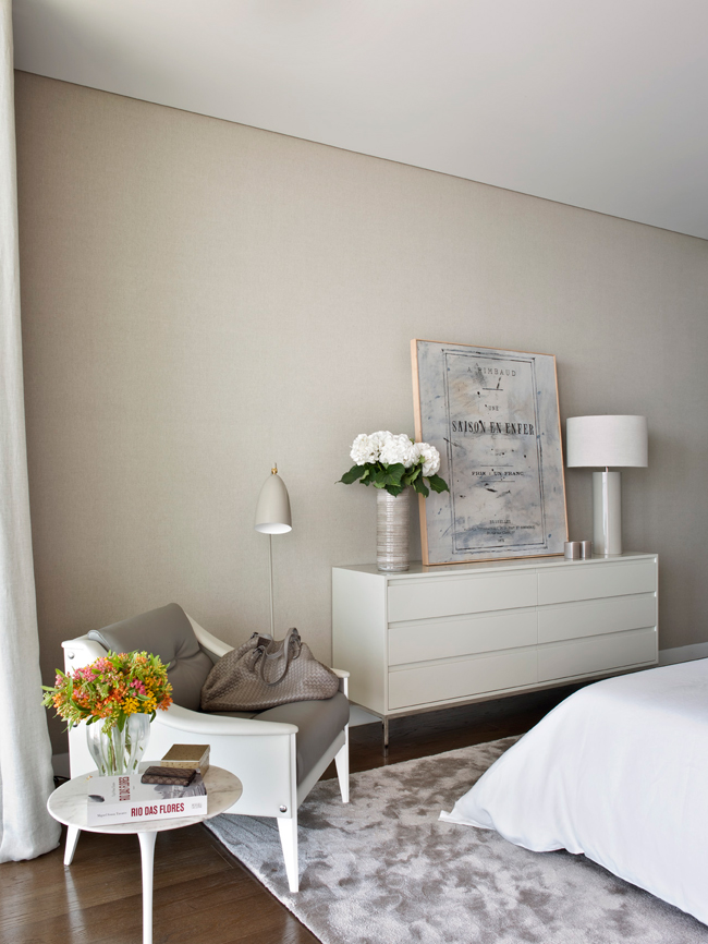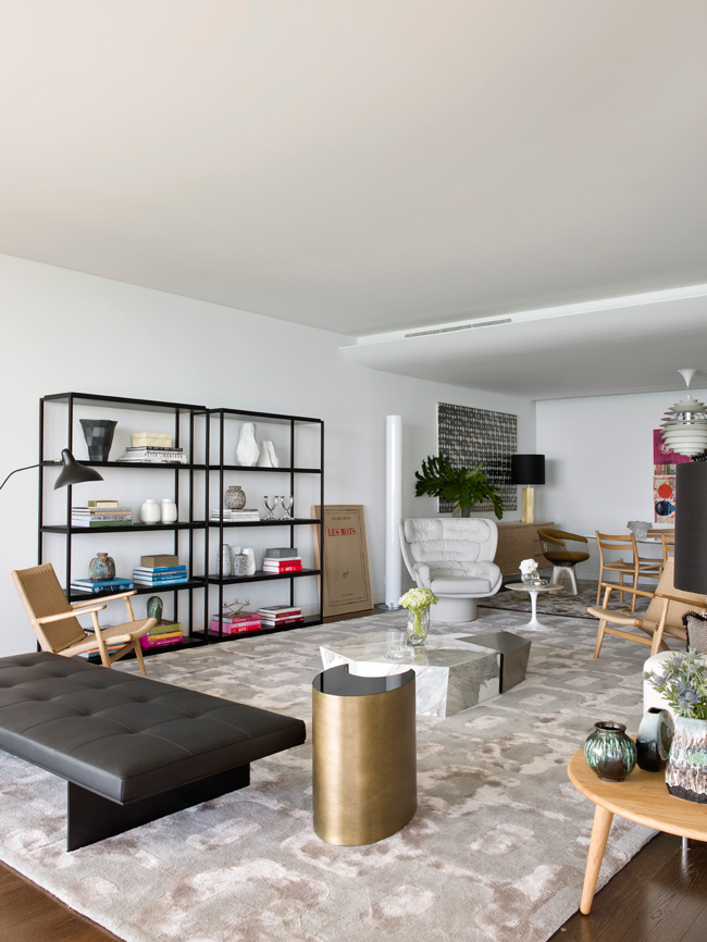 Cristina Jorge de Carvalho is a force to be reckoned with in the Portugese design scene, creating contemporary/modern spaces that are works of art and creating her own furniture collection that is very impressive. This 170 m2 apartment in Estoril is owned by a successful Brazilian couple as a holiday retreat and with space, openness, light and modernity as the briefing key-words, Cristina set out to create a timeless and contemporary apartment. Among classic pieces by Harry Bertoia, Flos, Hans Wegner and others are several from her own line, such as the storage unit and rug in the entryway. Cristina also made two significant interior architectural alterations to the apartment: the original wall that separated the entrance hall from the living/dining room was replaced by a rotating structure in brass and stainless steel and, with the impressive ocean views in mind, she added a mirror wall to the bar area which not only opens up the kitchen and bar area, but also reflect the light and view. The result is an incredibly beautiful space.