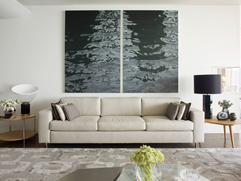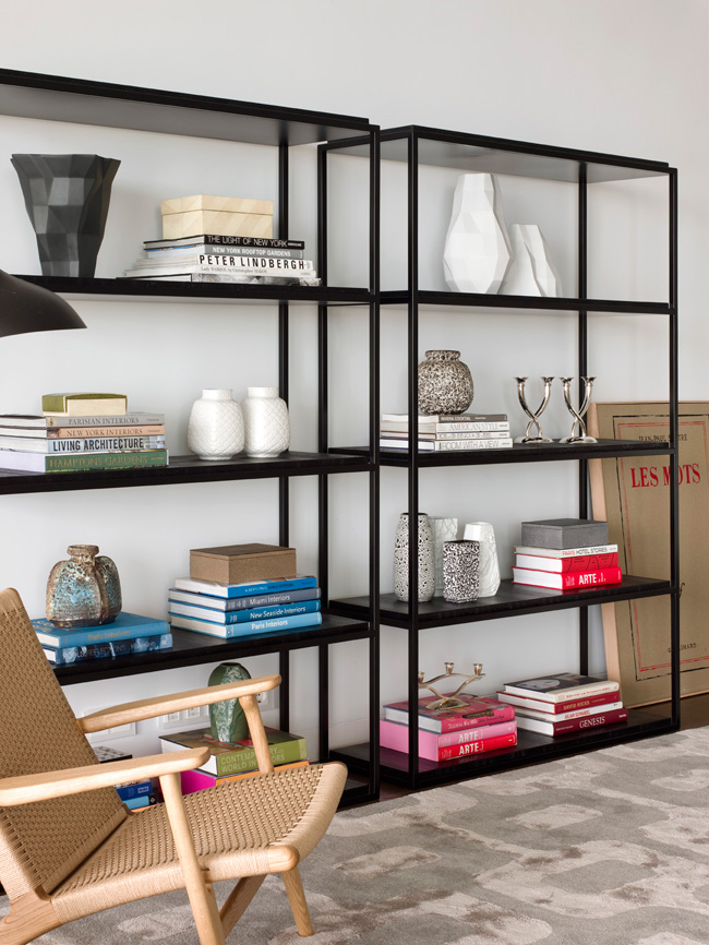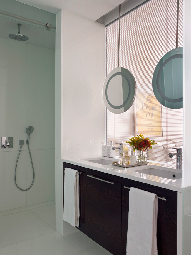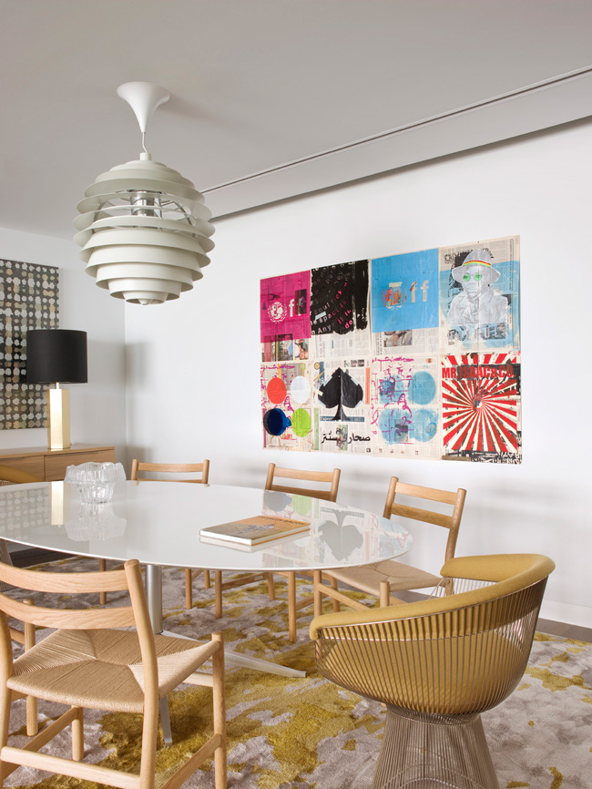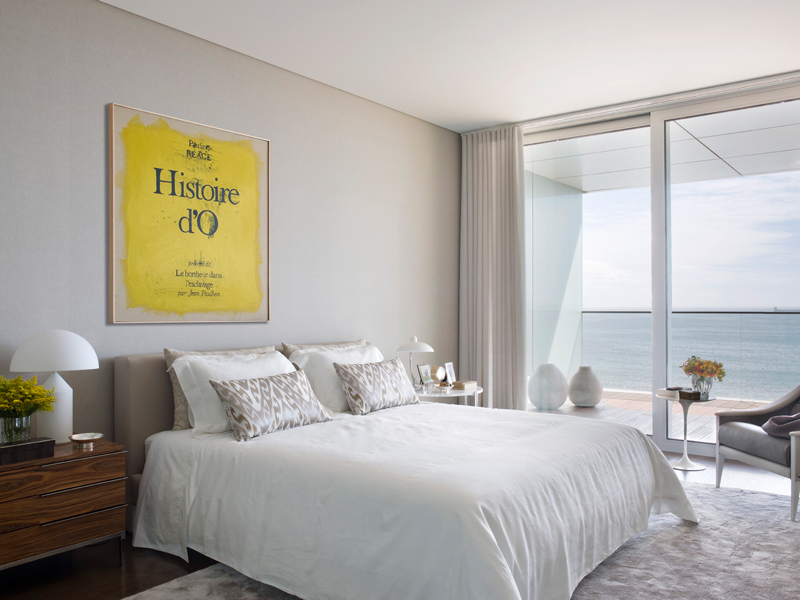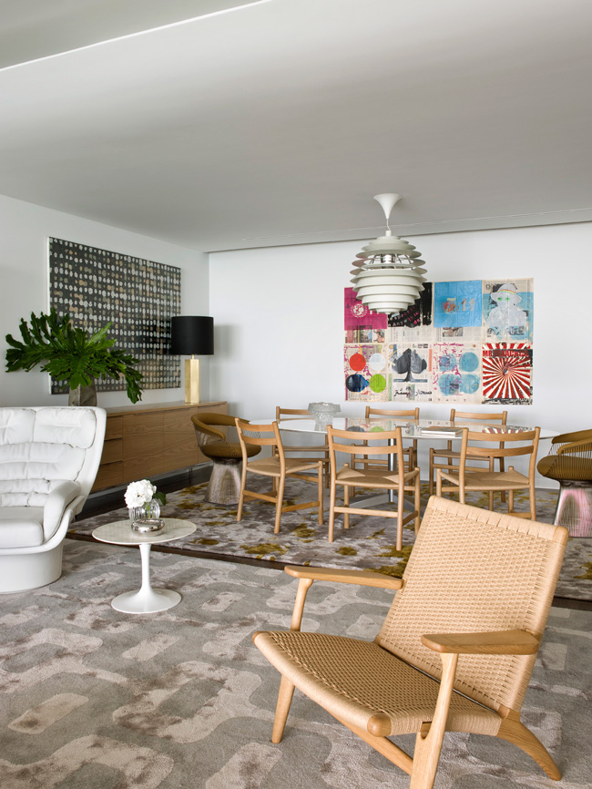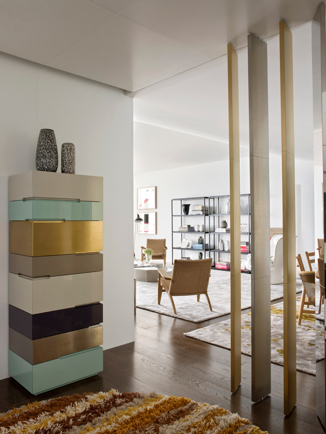 Cristina Jorge de Carvalho is a force to be reckoned with in the Portugese design scene, creating contemporary/modern spaces that are works of art and creating her own furniture collection that is very impressive. This 170 m2 apartment in Estoril is owned by a successful Brazilian couple as a holiday retreat and with space, openness, light and modernity as the briefing key-words, Cristina set out to create a timeless and contemporary apartment. Among classic pieces by Harry Bertoia, Flos, Hans Wegner and others are several from her own line, such as the storage unit and rug in the entryway. Cristina also made two significant interior architectural alterations to the apartment: the original wall that separated the entrance hall from the living/dining room was replaced by a rotating structure in brass and stainless steel and, with the impressive ocean views in mind, she added a mirror wall to the bar area which not only opens up the kitchen and bar area, but also reflect the light and view. The result is an incredibly beautiful space.