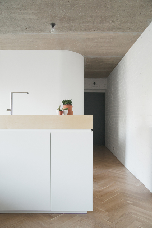 A contrast of white plaster and raw, rust-washed concrete. Painted brick counterbalances sleek kitchen cabinetry. A simple, bright, modernist approach was taken by architecture firm Crosby Studios with this 590 sq ft Soviet era apartment. The addition of plants throughout make this an A+ home in my book. (More of their work here, here and here)