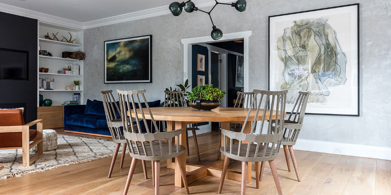 I loved the plain blue sofa. The dining area is pretty and welcoming. I want the same comfortable chair you installed. From rug to wallpaper, everything is awesome.