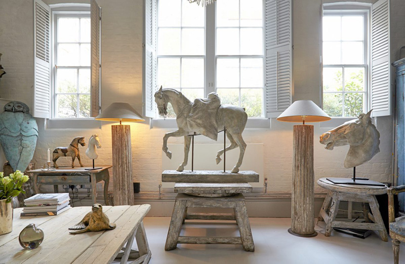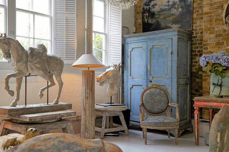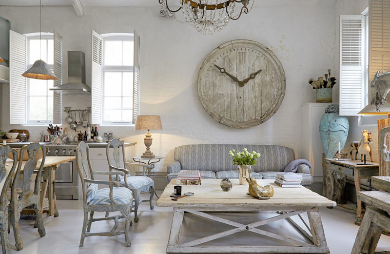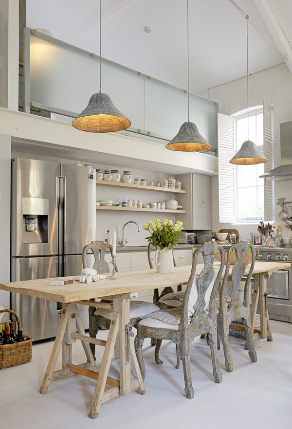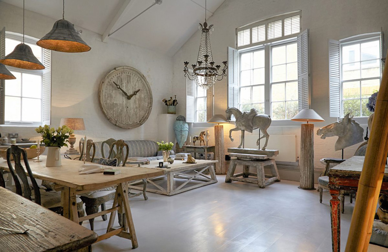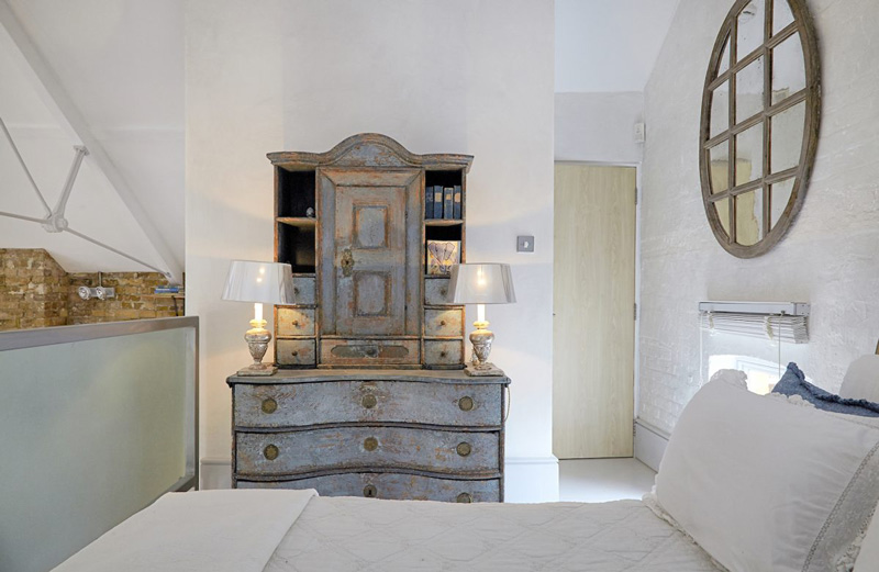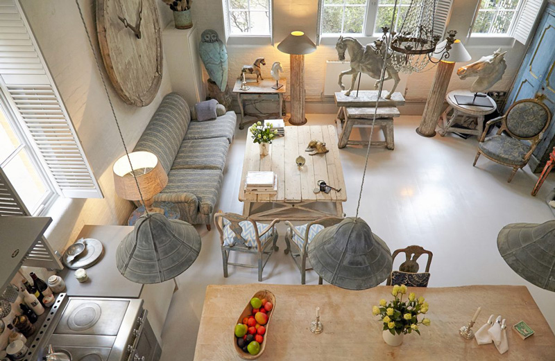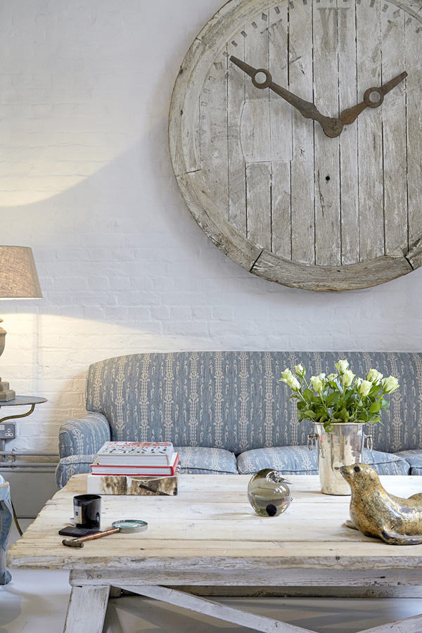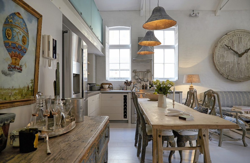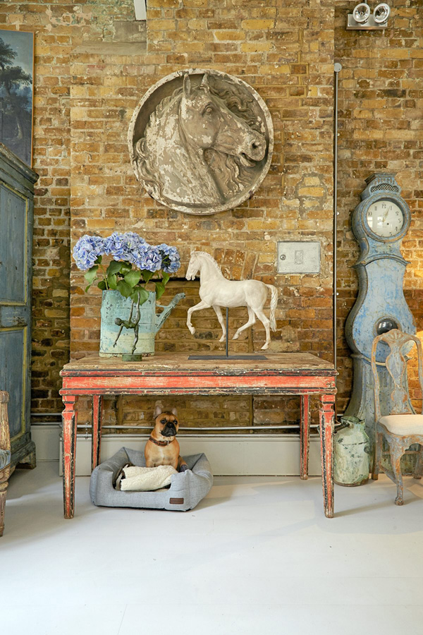 When you would expect someone decorating a converted lofty school house to go the industrial route but instead they go with a classic Scandinavian/shabby chic look. Kudos to the owners of this home in Battersea, London for going against the grain on this one, and for the very impressive collection of antiques. And for the cute dog. This is really beautiful. Available as a location home through Shoot Factory.