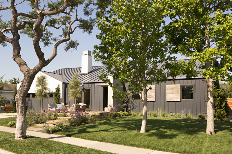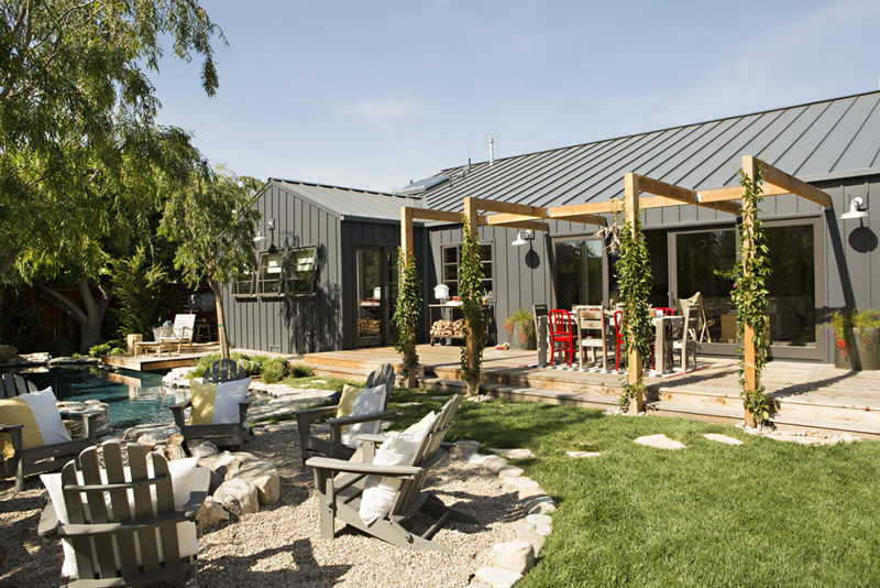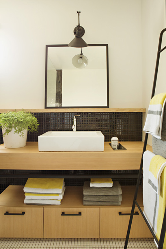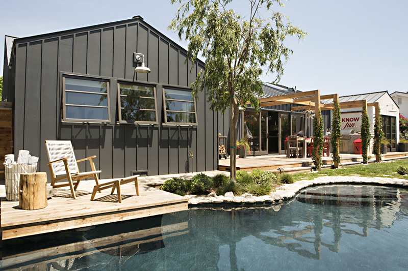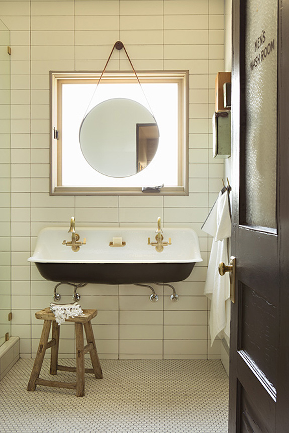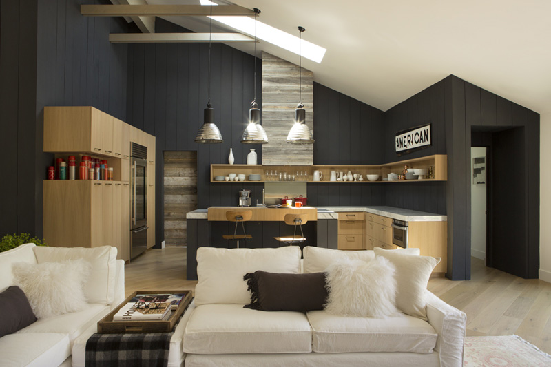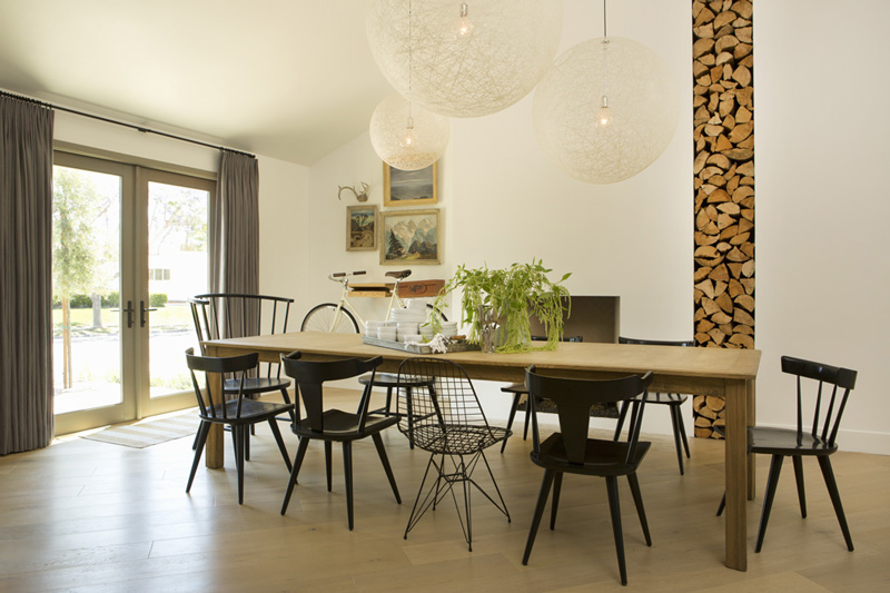 I love everything about this California house designed by architect/designer Eric Olsen. There’s the understated dark exterior, the semi-dark-painted kitchen with awesome upper display shelving, the wood stack in the dining room and modern mismatched chairs, the creative paint job in the bedroom, the tile in the bathrooms and the backyard oasis. Dreamy!!!