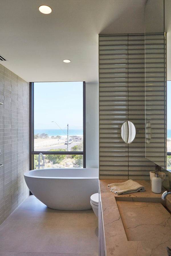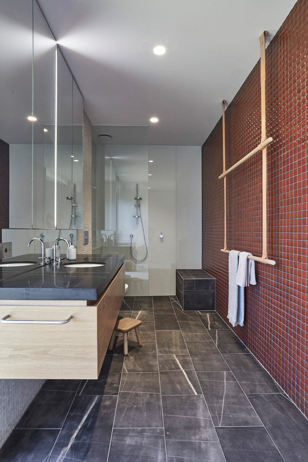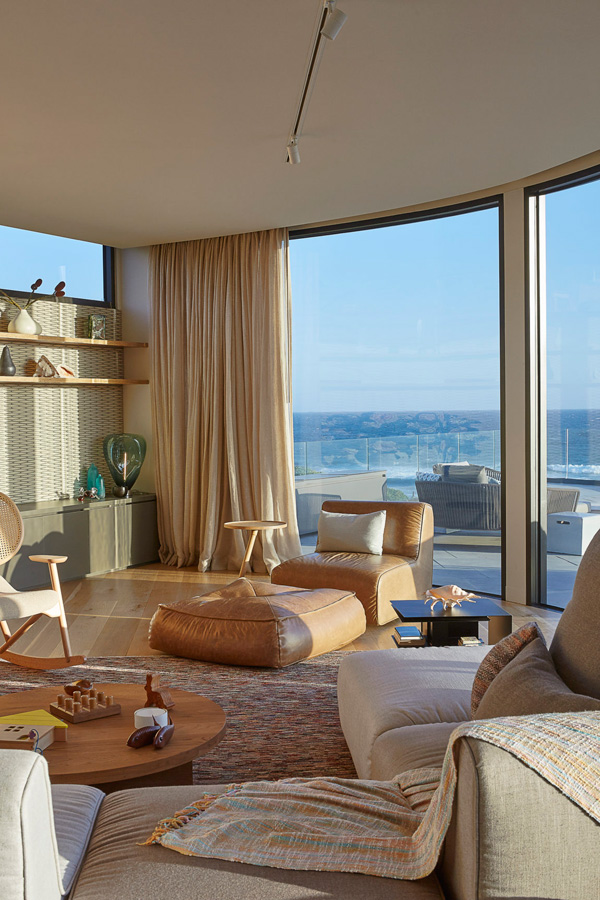 With views like this who cares what the house looks like?! But when it’s as fabulous as this – BONUS! An interior landscape is created which merges into the surrounding external landscape. Materials and colours are drawn from the local environment and counterbalance the intense blue ocean hues. Natural timbers, local stone, textures tiles and muted stones are selected to mimic the surrounds. Selected paint and tile colours reflect the deep oranges and reds found in the local stone and local flora. The house is grand in scale, yet the spaces are relaxed yet sophisticated, modular and flexible. The balanced selection of imported and local furniture, lighting and materials celebrates the quality of local design within a global design environment. By FMD Architects.