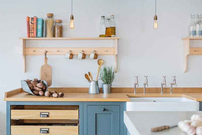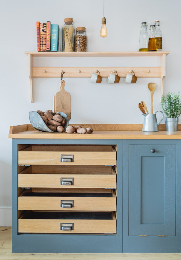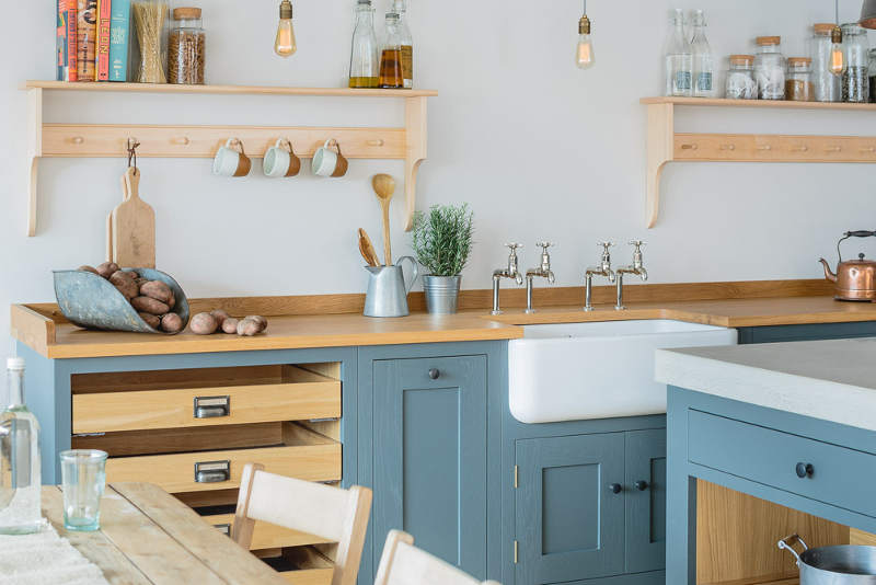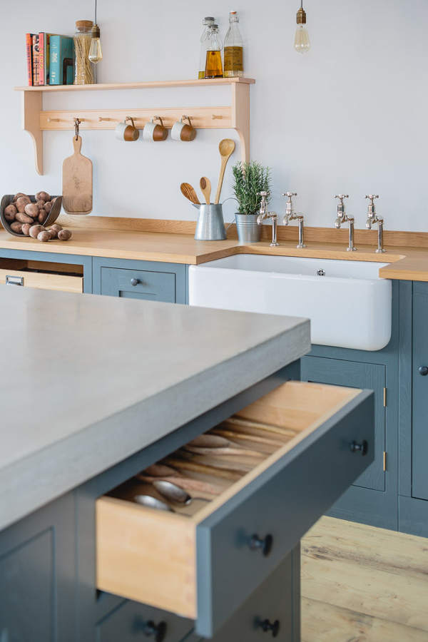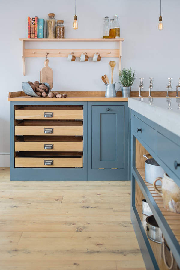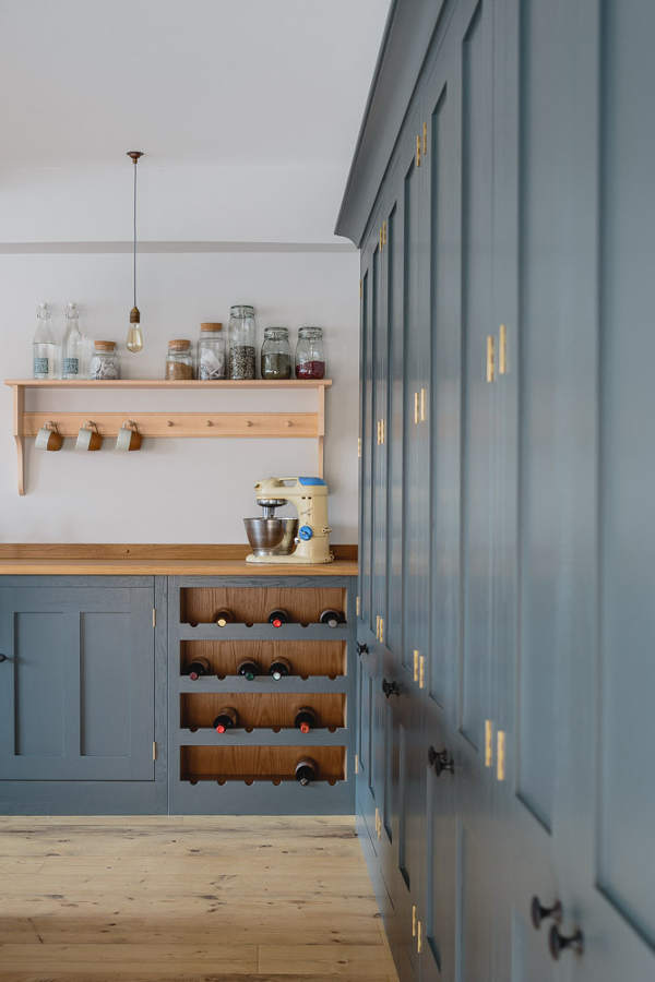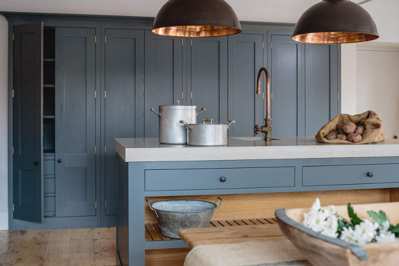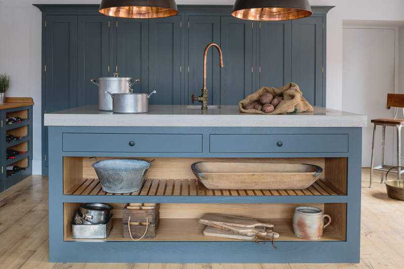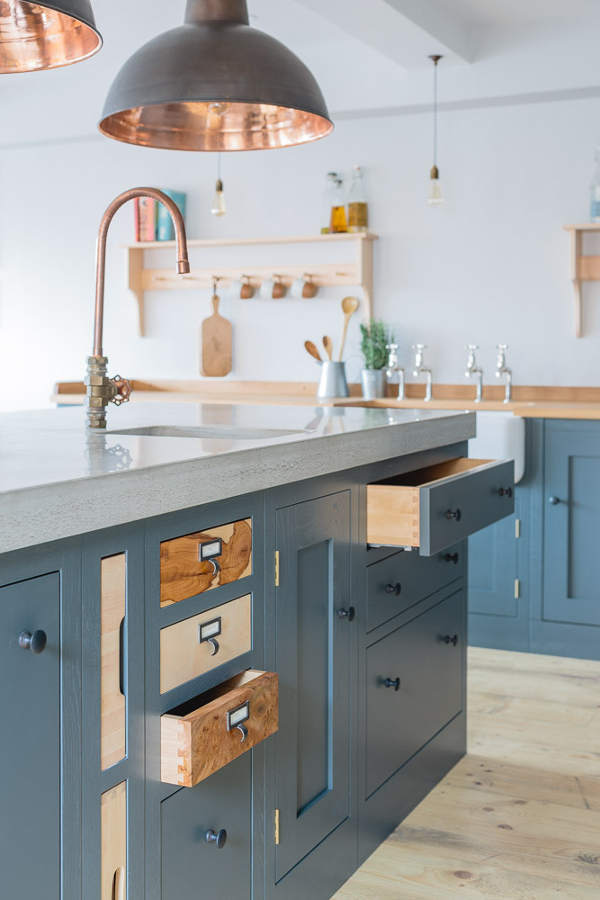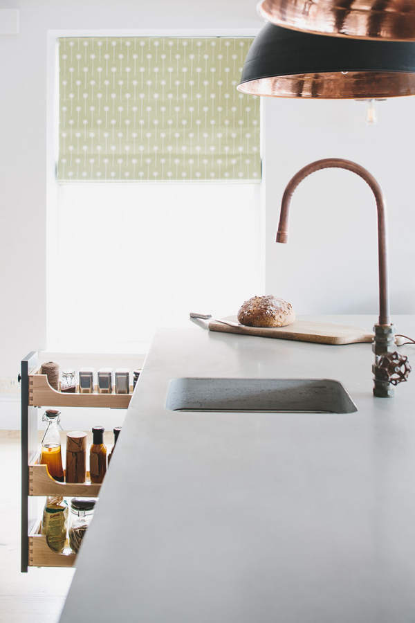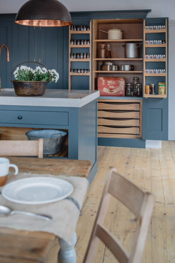 “Industrial” and “Shaker” – not two words that usually go together but this showroom kitchen sees Bristol-based Sustainable Kitchens take a classic shaker-style cabinet and up the ante with a concrete counter, industrial-style tap, copper pendent lighting and reclaimed scaffold plank flooring. The wall of larder cupboards has me swooning but then you all know I go weak at the knees for a good British kitchen.