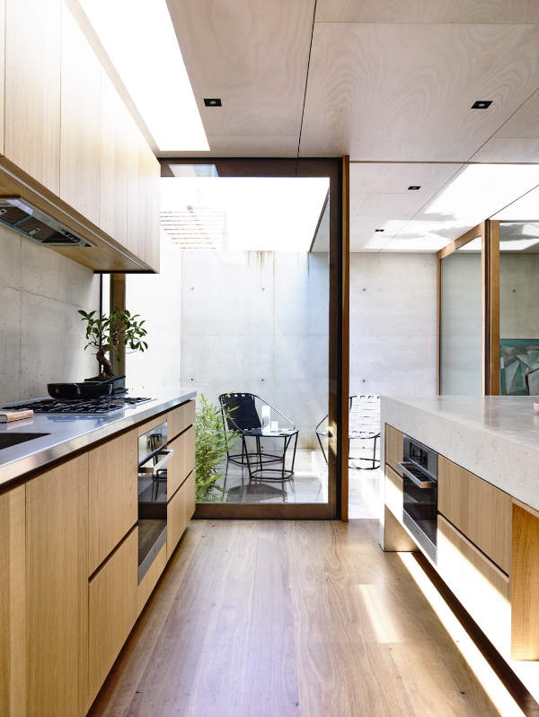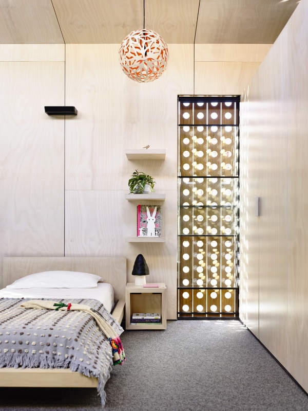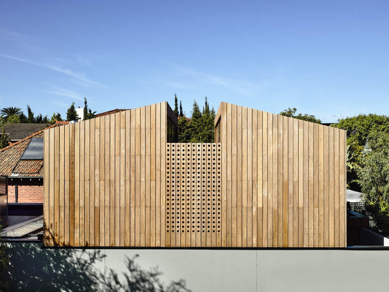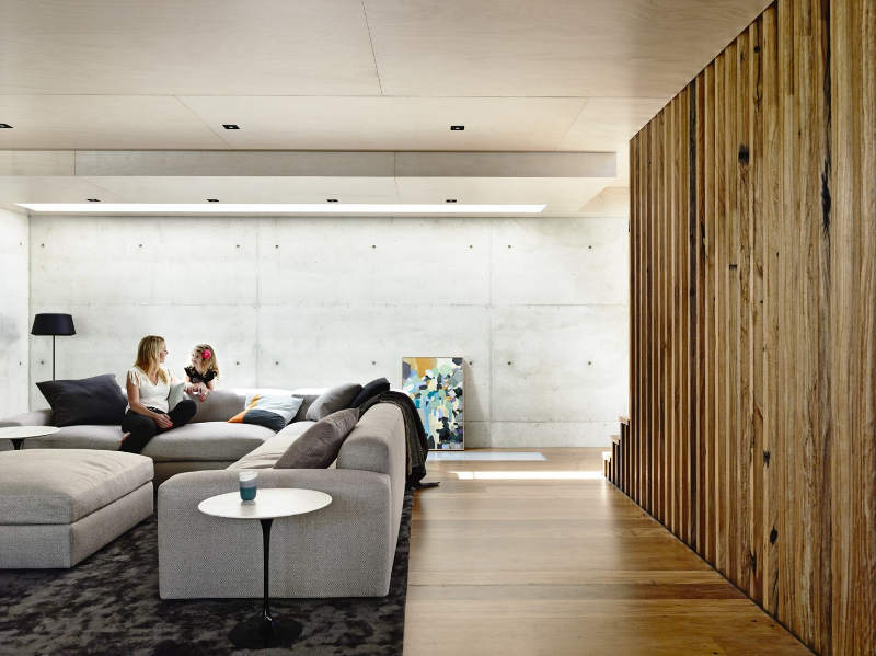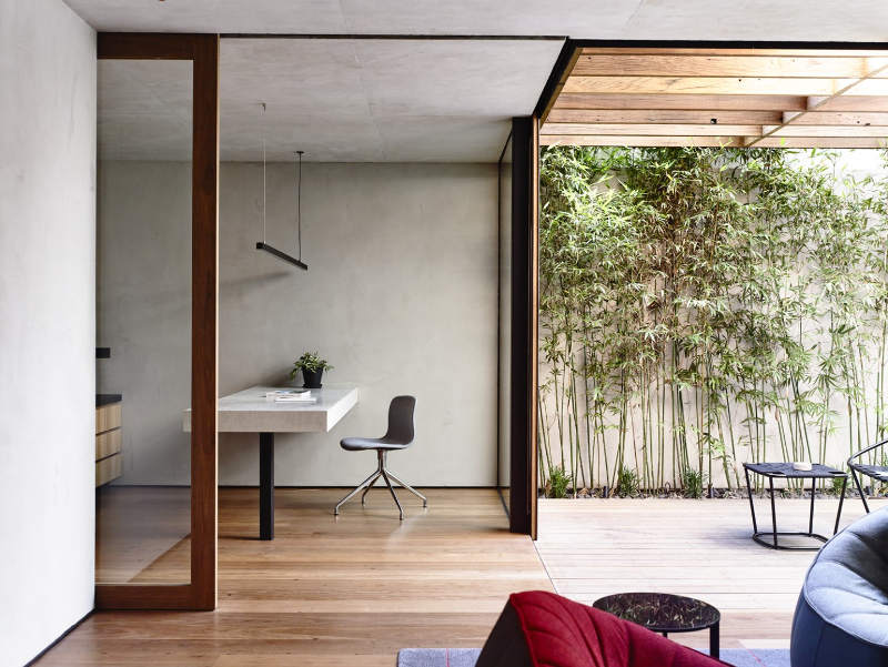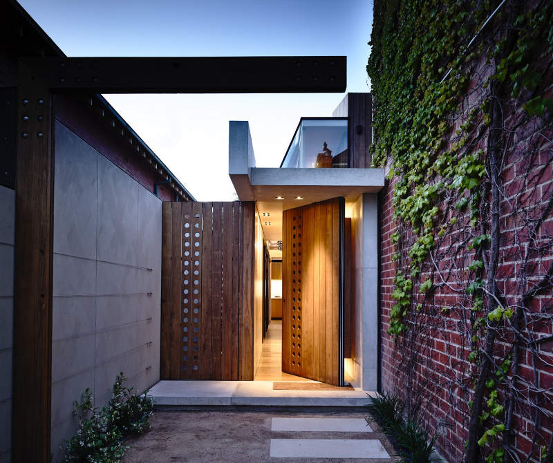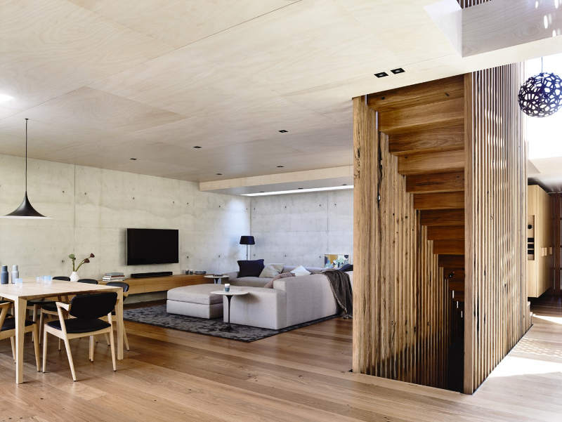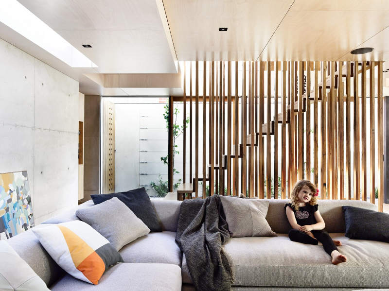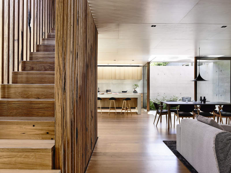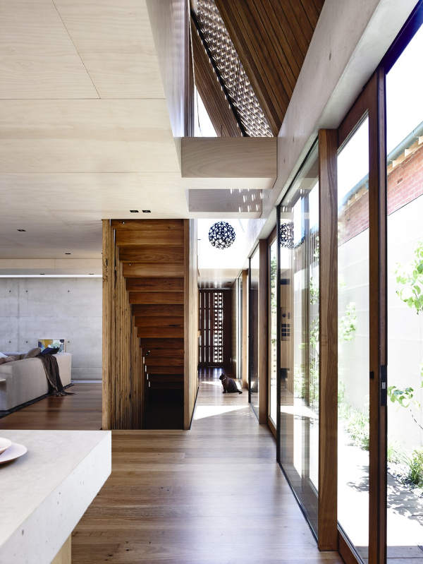 Internal courtyards and screens allow this home to be open and light filled without sacrificing privacy. Concrete grounds the open plan building providing solidity while walls of glass, slats and perforations allow light to penetrate throughout. Plantings soften and mellow, golden timbers warm. A contemporary family home by Melbourne-based Schulberg Demkiw Architects.