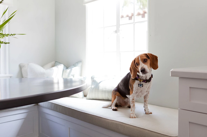 West Hollywood interior designer Erin Kane creates simple, relaxed, easy-on-the-eye spaces that endure the test of time. Her designs seamlessly balance function and style. And there’s an adorable dog on a banquette bonus photo 🙂