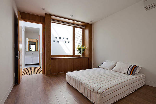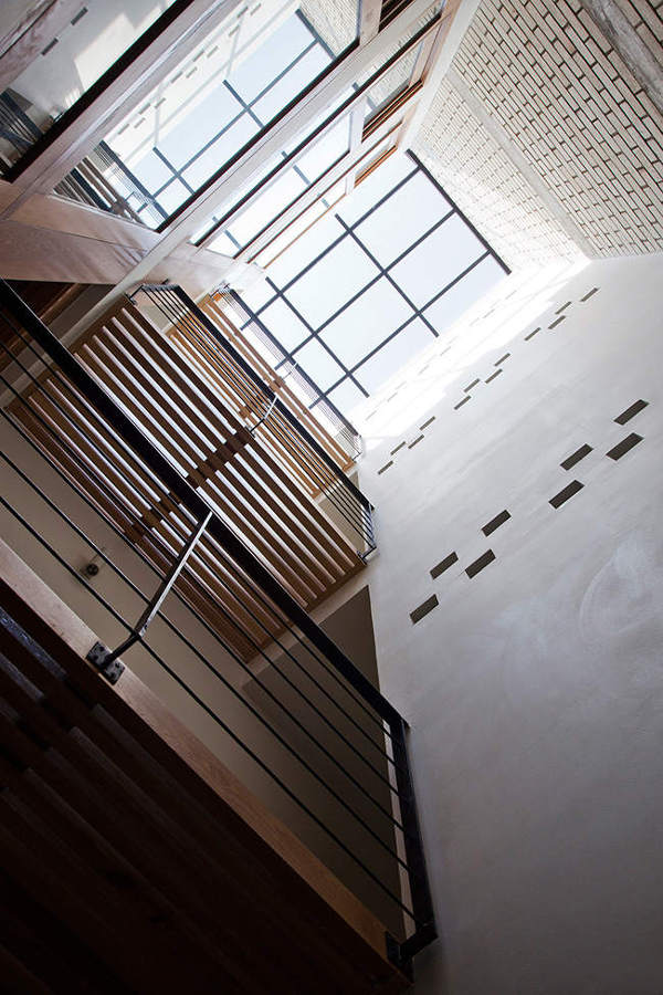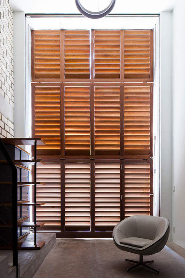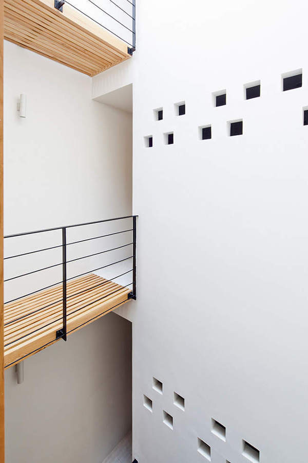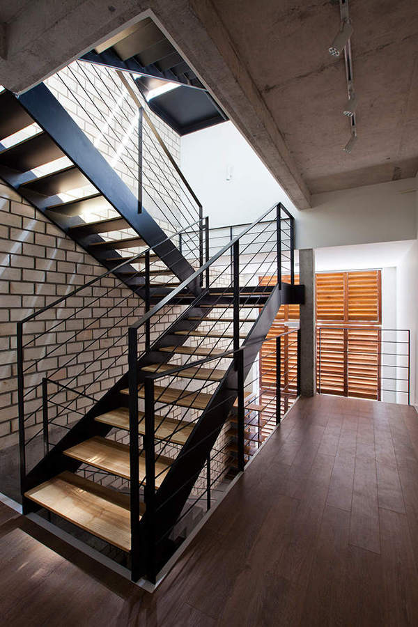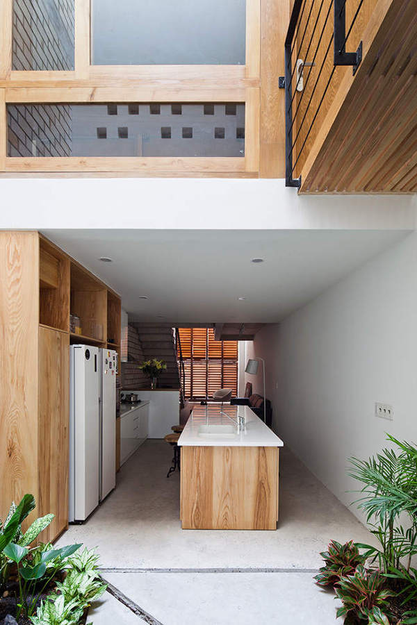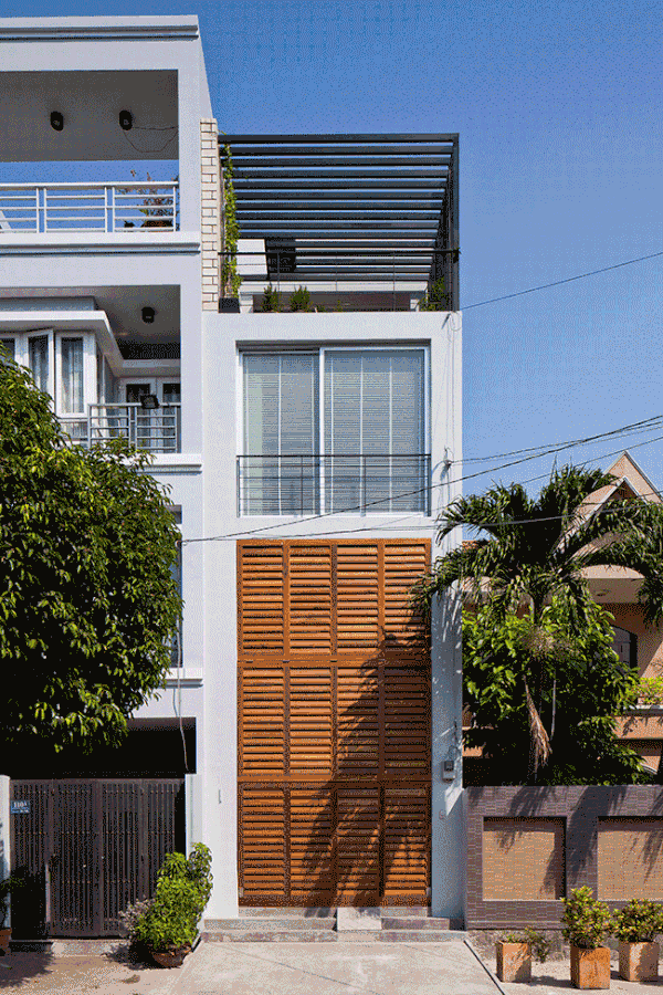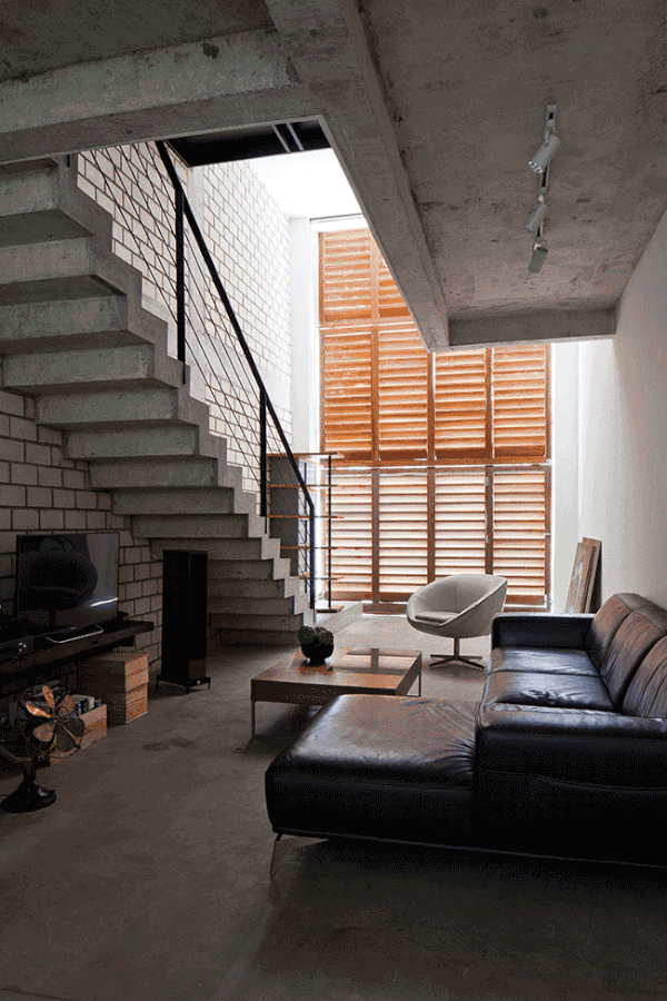 Only 4m wide and 17m deep this contemporary concrete and brick house rises above a busy street in Ho Chi Minh City, Vietnam. The minimalist, modern home references the traditional shop houses of the area with a blurring of private and public spaces at street level achieved by a folding shutter which also moderates shade and ventilation. A large central skylight allows light to penetrate to the inner rooms. By MM++ Architects.