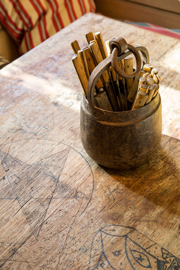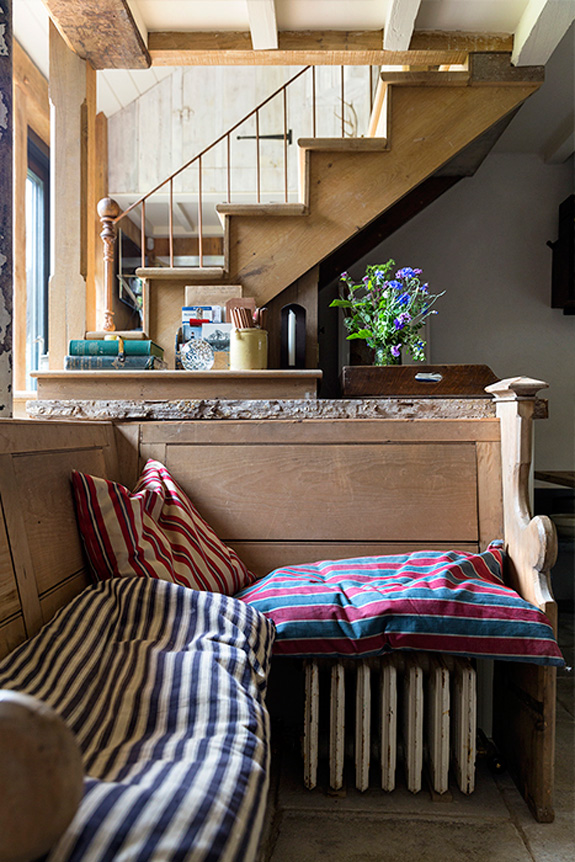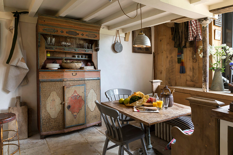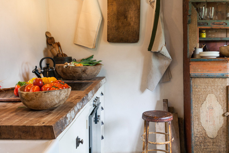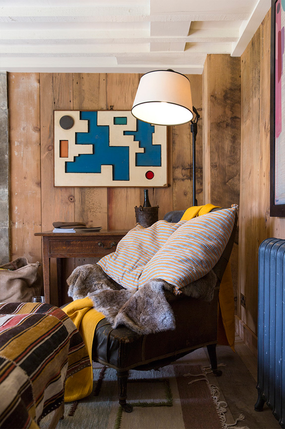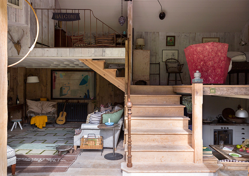 I want to spend the entire summer in this glorious structure (whenever summer decides to show up after we unbury ourselves from the copious amount of snow we’ve received). The aesthetic and design decisions for this project were led by the desire to restore what is natural to the interior. The aim was to create another world, to offer an escape but one grounded in the history and purpose of the original building. Great attention was paid to choosing materials that would be in keeping with the original building as well as finding the most skilled craftsmen to work with them. Local timber was used for the floor and walls, sourced from a nearby salvage yard, the fine wrought iron handrail was handmade by a local blacksmith, even such details as the wooden door latch on the bathroom have been handcrafted. The interior itself has been filled with an eclectic mix of the very best antique pieces alongside contemporary lighting and some of Howe’s signature bespoke designs. A beautiful painted regency chest of drawers sit below a large 1950s Serge Mouille three-armed ceiling light in the bedroom, Swedish mid Century flat weave rugs bring bold colour to the space and an original Royere wrought iron standard lamp provides reading light over an antique battered leather armchair. By Christopher Howe.