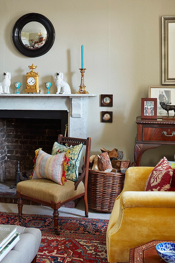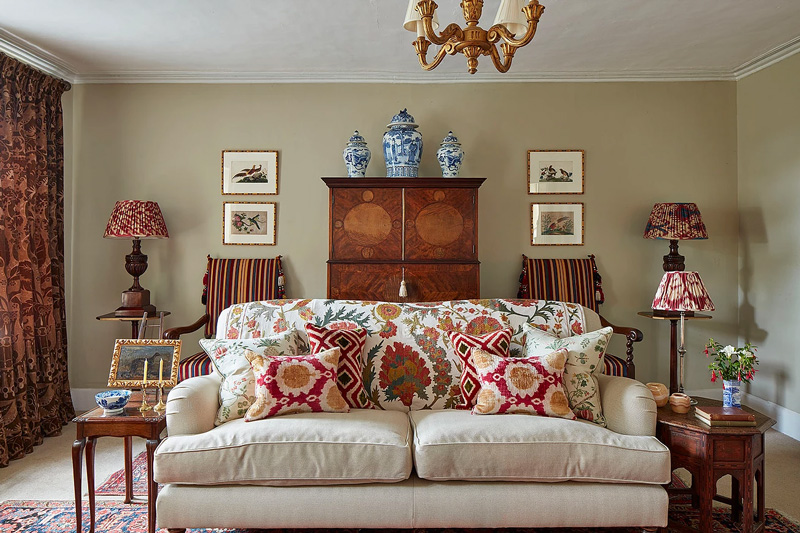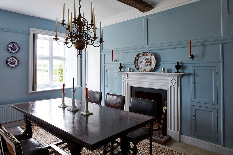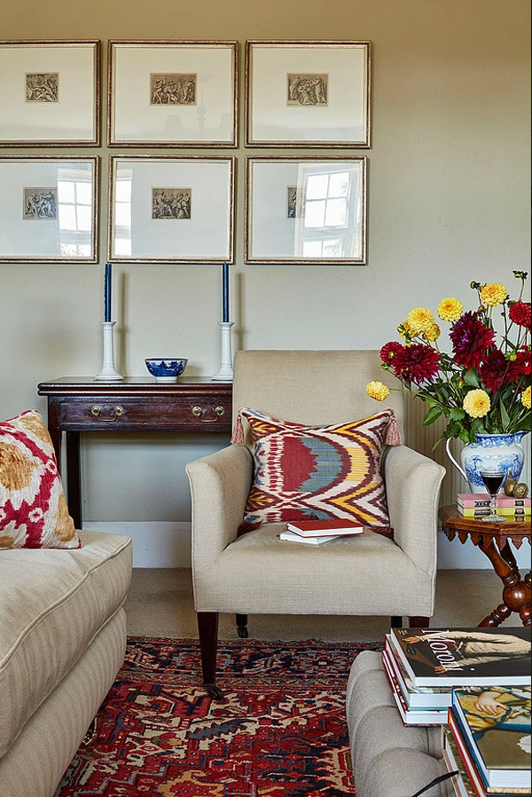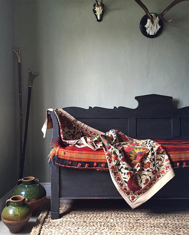 I am crushing on this quintessentially English manor farm in Norfolk, U.K., home to interior designer Carlos GarciaWhile quite traditional it has elements that are a bit more eclectic and less country than you would expect. A bench painted matt black, pale blue walls, Eastern fabrics such as suzani and ikat….all make this very intriguing.