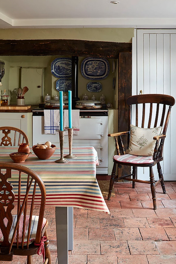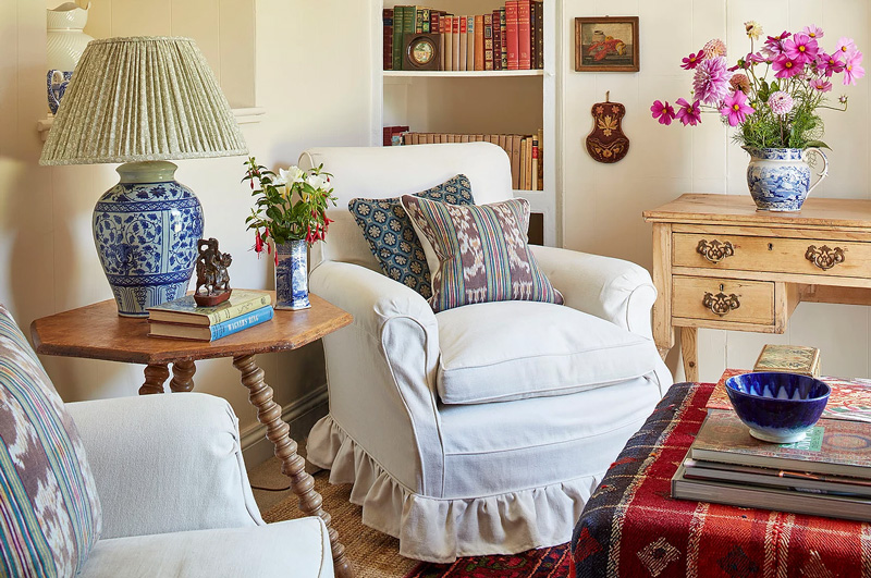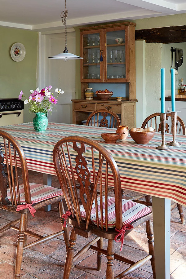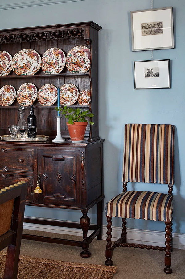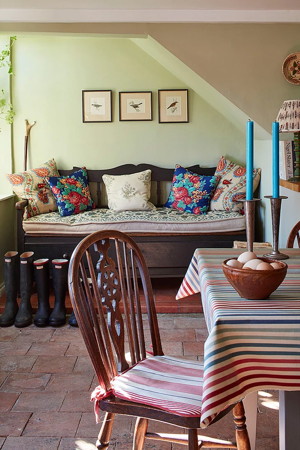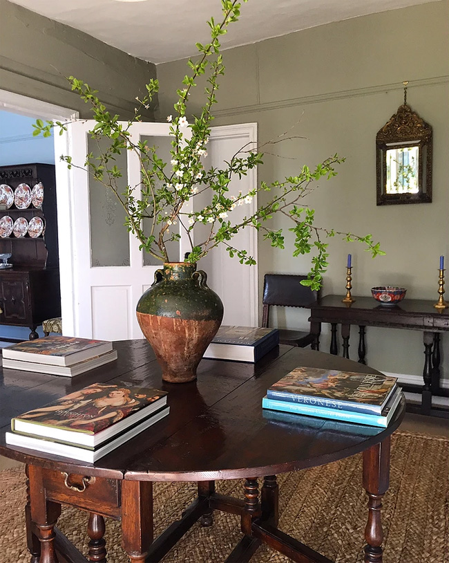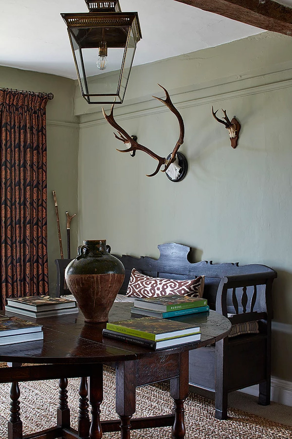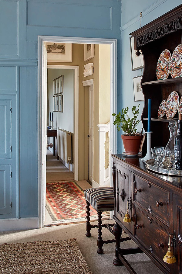 I am crushing on this quintessentially English manor farm in Norfolk, U.K., home to interior designer Carlos GarciaWhile quite traditional it has elements that are a bit more eclectic and less country than you would expect. A bench painted matt black, pale blue walls, Eastern fabrics such as suzani and ikat….all make this very intriguing.