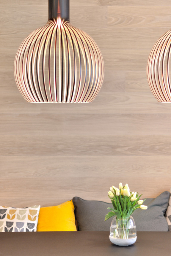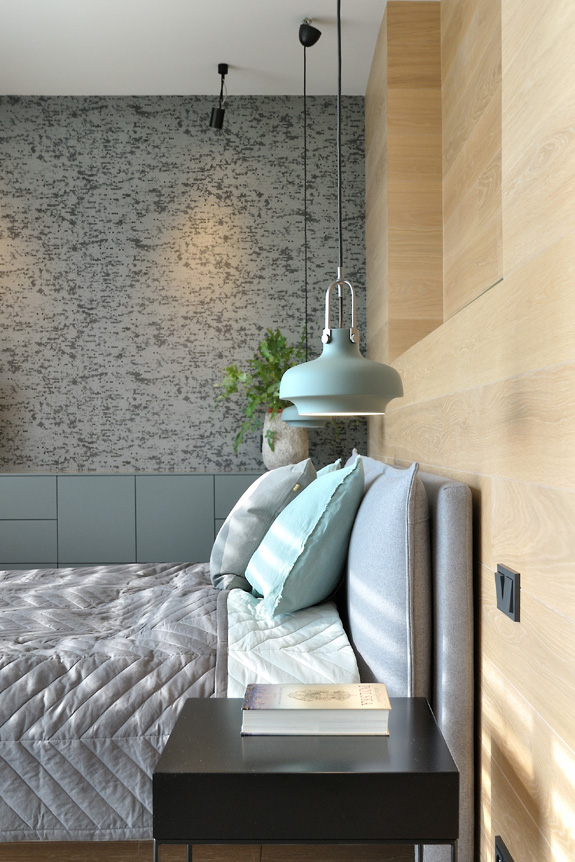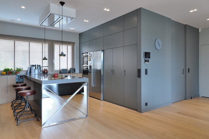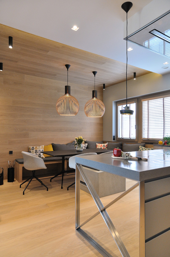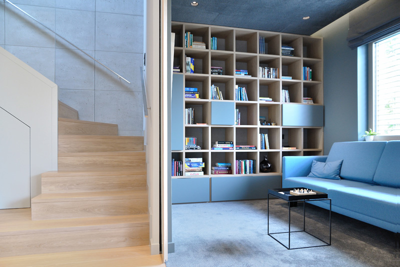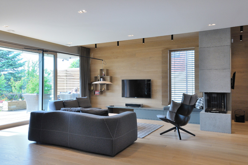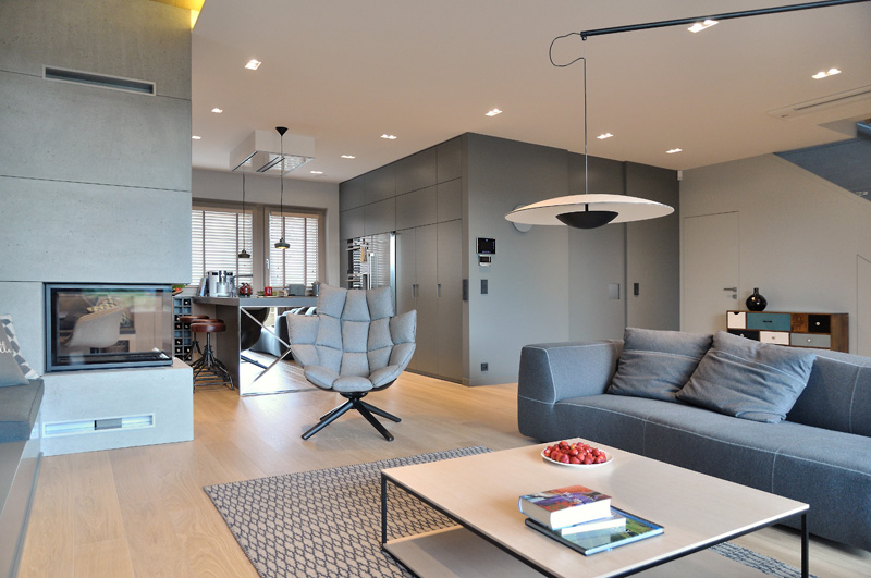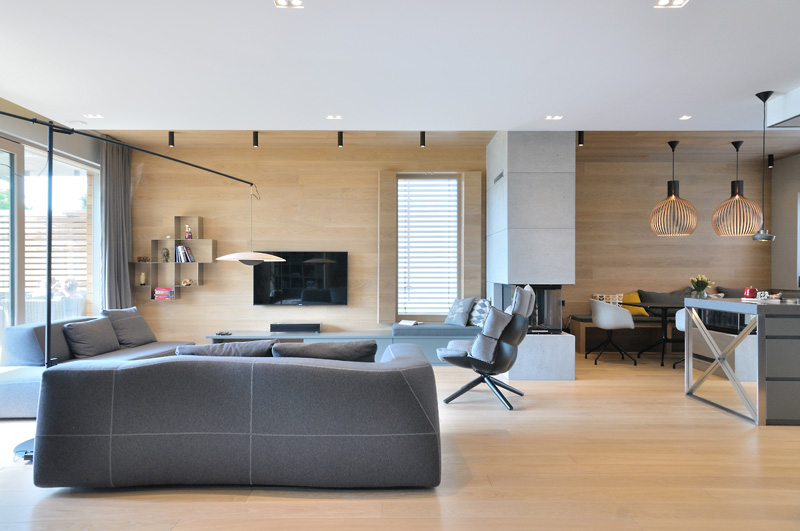 Marcin and Magda Konopka of Polish design firm Ministerstwo Spraw We Wnętrzach (Ministry of Interior Affairs) has sent us photos of one of their latest projects. The other day I featured a “small” apartment in Sweden and was told that 71 m2 is not small by Swedish standards. Okidoki, my last home was 800 sq ft and yep, it was small! In this case though I think I can safely say this is a HUGE house at 300 m2 and no one is going to argue that fact. MSWW has created a warm yet modern home with light oak clad walls and floors, concrete elements, a grey colour scheme, comfy furnishings and some fun lighting. (More of their projects can be found here)