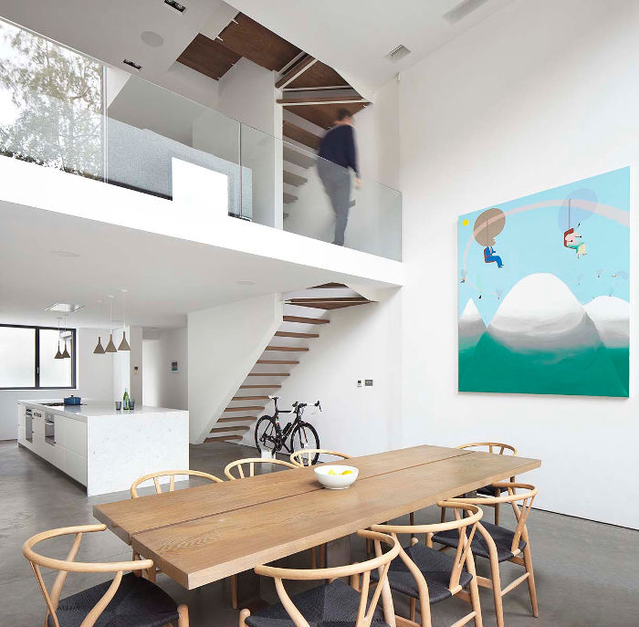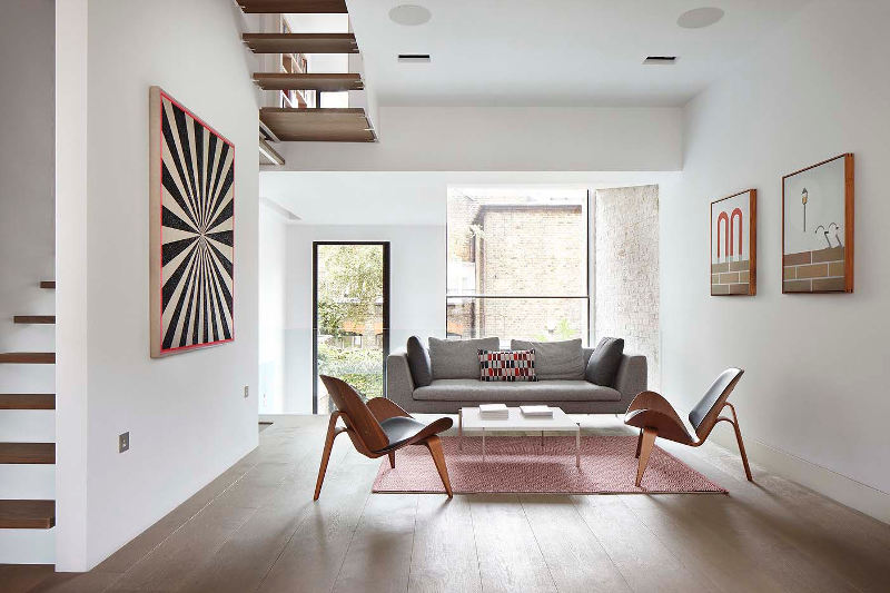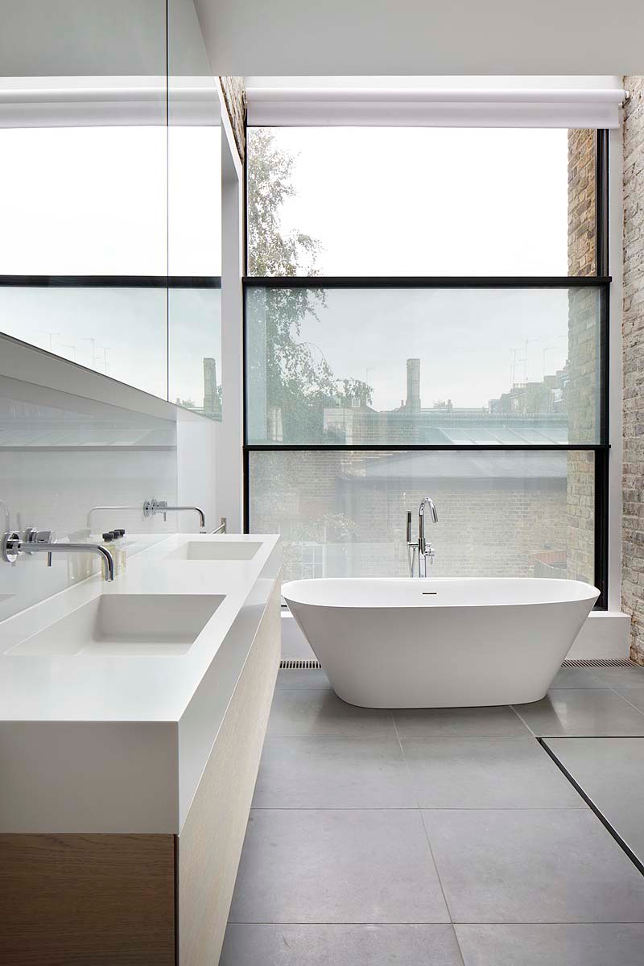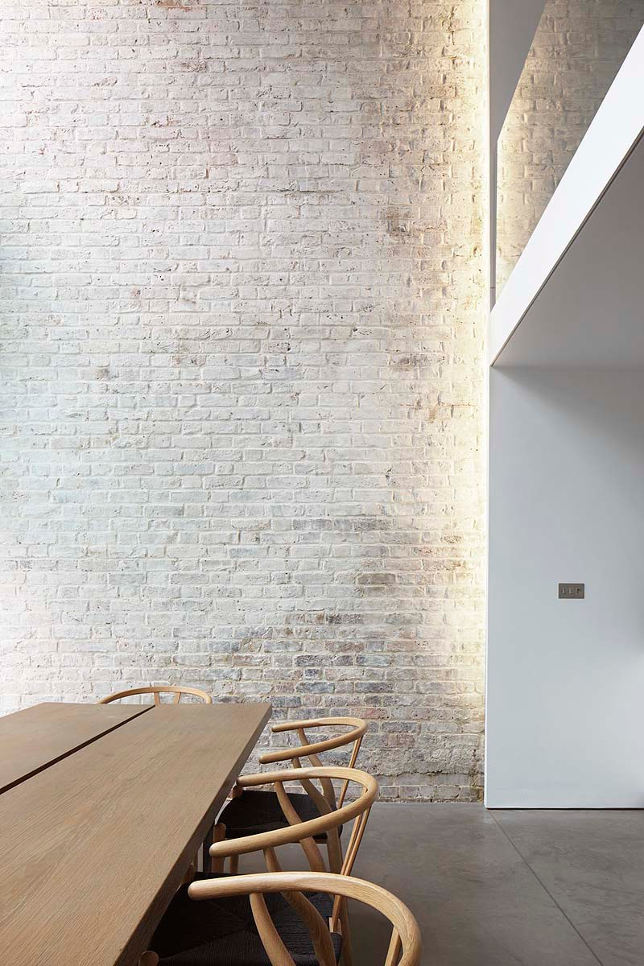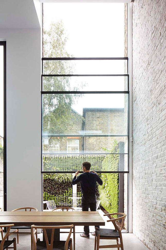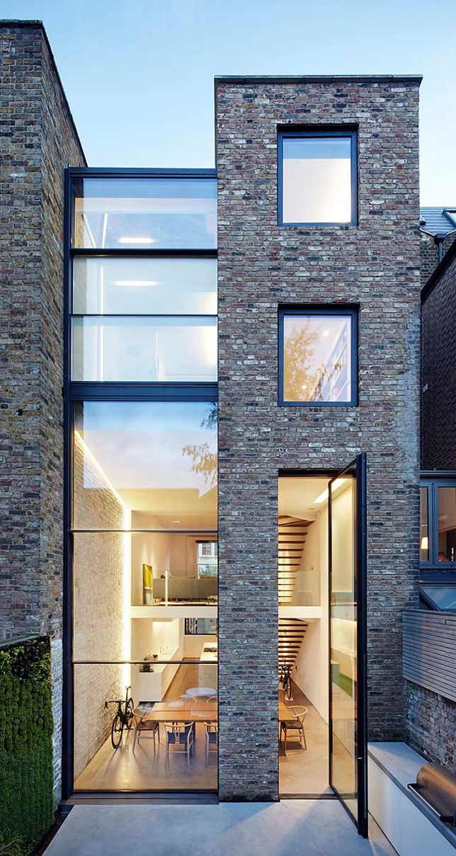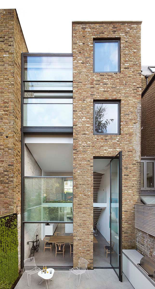 I love the verticality of this modern extension to a Georgian terrace house. Renovations in the 1980s had left the floorplan confused and ceilings lowered. By inserting a glass infill between the narrow back wing of the house and the neighbour’s wall the ground floor now has a soaring double height ceiling while a master suite is reached by an open tread staircase. Slot house by London-based architectural firm Studio Octopi.