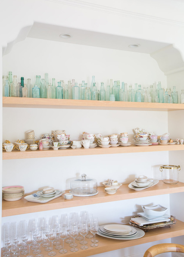 Love the kitchen shelves with the collections of teacups and old green bottles. Hmm where can I do this. The rose wallpaper is a WoW. Thanks for sharing…loved this one.