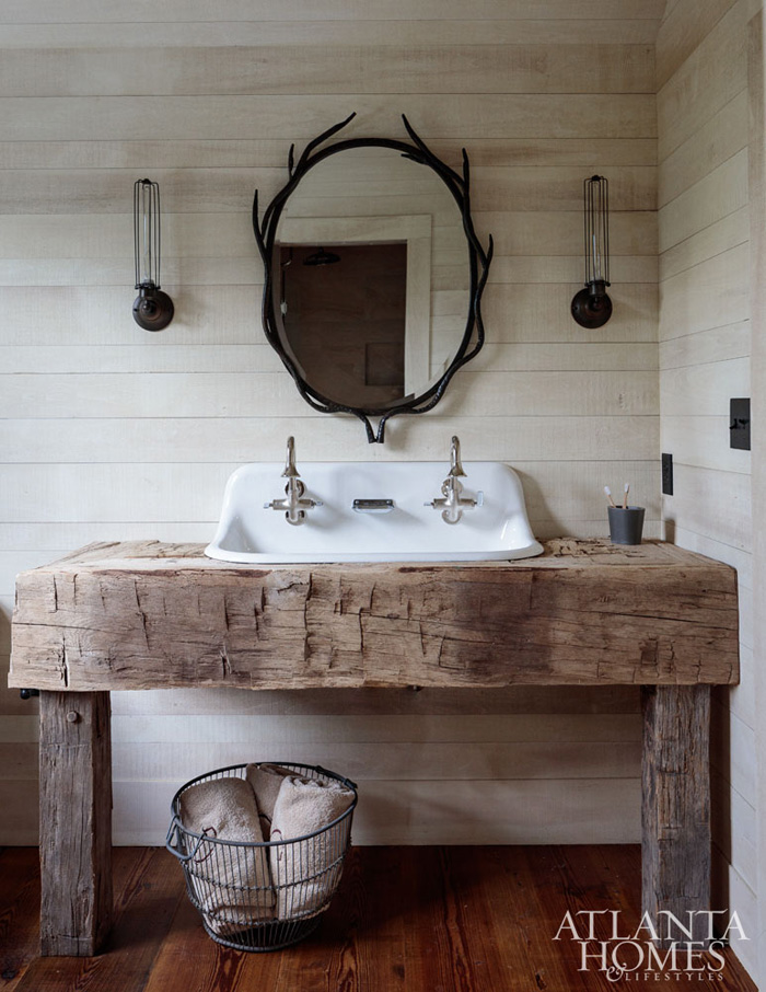 It's lovely, but it needs a slab of white marble around the sink. Can you imagine how awful that rough wood surface will be after six months of dust, water splashes, toothpaste spatter and drips of liquid soap?