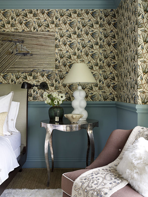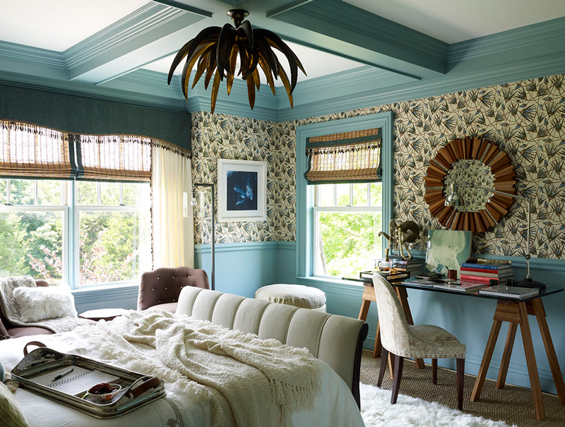 I am totally in love with this bedroom by Katie Leede. It is from a 2012 Hamptons showhouse and I am dying over the beautiful blue (what would you call this shade?), the graphic floral wallpaper, the upholstered sleigh bed, the shag rug, that incredible light fixture… YES PLEASE!!!