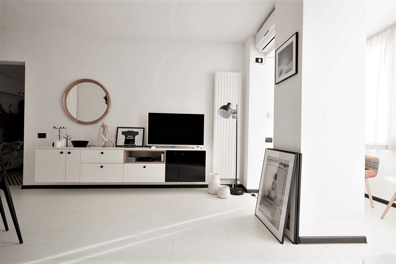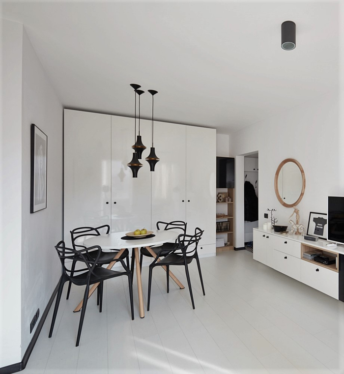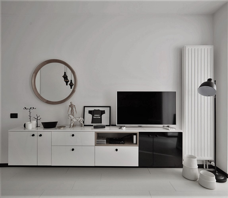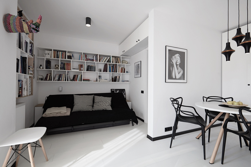 Architect and interior designer Alex Calin sent in this project of a small, Nordic-inspired minimalist apartment that I wanted to share: The studio has about 40 sqm and it is located downtown Bucharest, in a building located near the Cismigiu park, in a historical city center. By the time we started the project, nobody had made changes or improvements of any kind from the date of commissioning of the use, somewhere in the mid 60s. The significant changes were losing the balcony and inserting it into living space. This is how a little space for conversation and a work area appeared and at the same time this has increased glass surface adding up extra light. One of the former windows has got a bookshelf open on both sides that filters light in the sleeping area and delineates pleasantly the interior space. The furnishings are in shades of white, with small touches of oak and dotted here and there by a few spots black. The minimal furniture has a touch of nordic inspiration. All the furniture was designed and executed together with partners from Mobilaunicat.ro and is made to completely cover the minimal needs posed by such a space. The owner has a passion for film and music (he works in the creative industry) so the walls are decorated with black and white portraits of several iconic characters (Tilda Swinton, David Bowie, Grace Jones and Patti Smith).