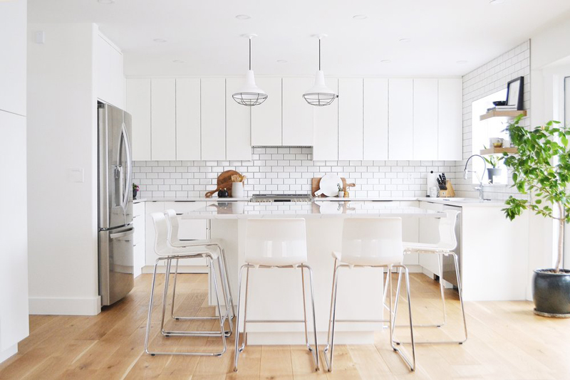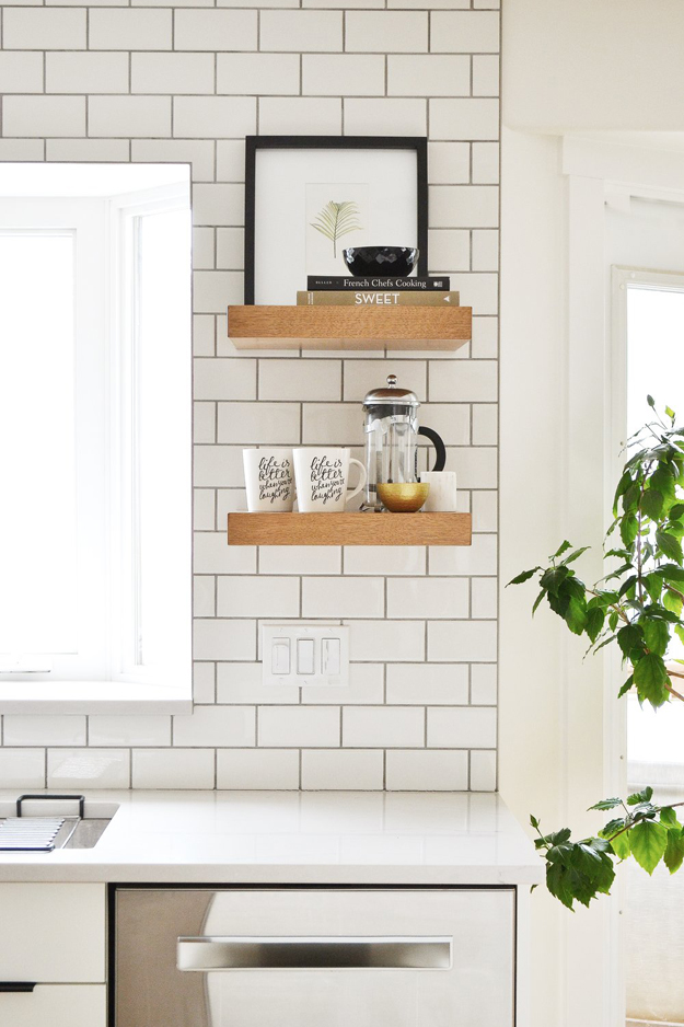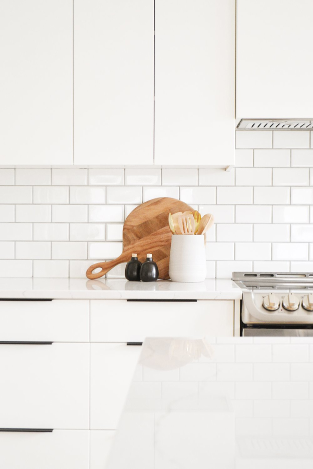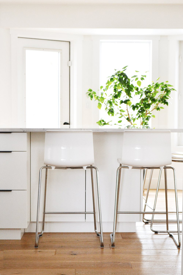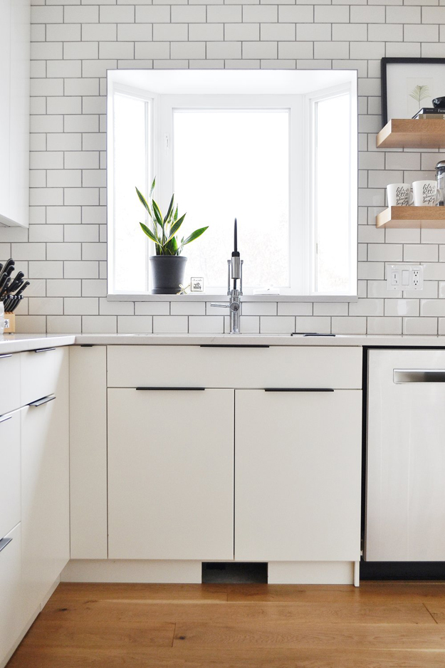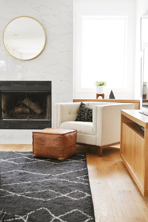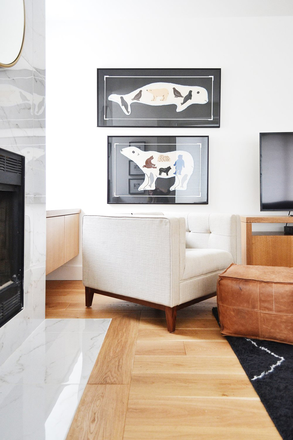 This home in Winnipeg, Manitoba was given a main floor renovation and Jaclyn Peters gave the space a modern and minimalist makeover with an earthy vibe that I love. We started with oiled white oak hardwood flooring and a neutral color palette.  The kitchen was completely gutted including the builder basic corner pantry and the breakfast nook was utilized to create space for a new large island topped with Quartz countertops and seating for 5. We added two floating white oak shelves for warmth and texture, then a classic white subway tile backsplash and industrial lighting by Schoolhouse Electric. Two windows flanking the new marble fireplace surround were added to the living room, as well as custom made white oak floating cabinets and a custom media stand.  All new furniture, rugs and accessories create a cozy space to entertain. The Scandinavian inspired powder bath features charcoal slate tile, black millwork, white quartz counters, black pendant light and more art from the homeowner’s collection.