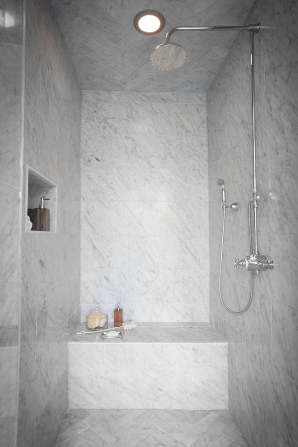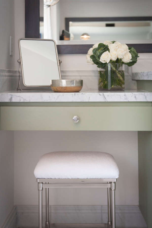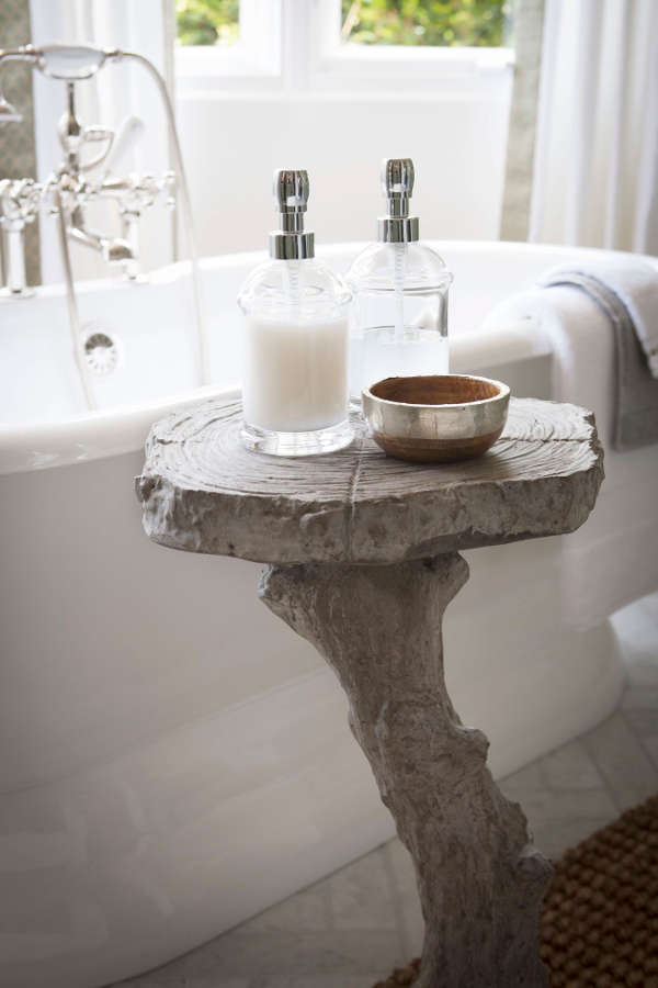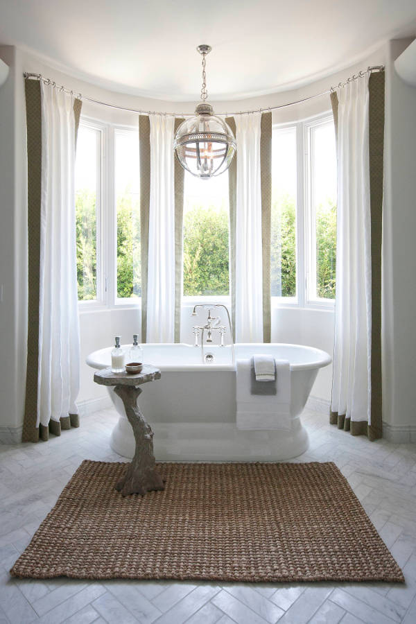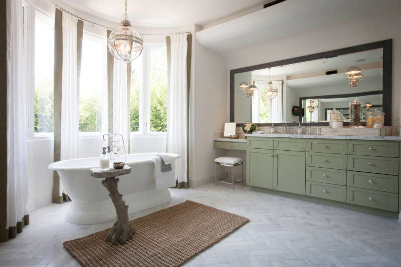 Oh it’s you! Didn’t see you there. I was too busy soaking in my bubble bath taking in the view. Love this bathroom by Jeff Trotter Design. Love the herringbone stone floors, the soft green vanities, the rustic texture added by the rug and that too too cute faux bois table.