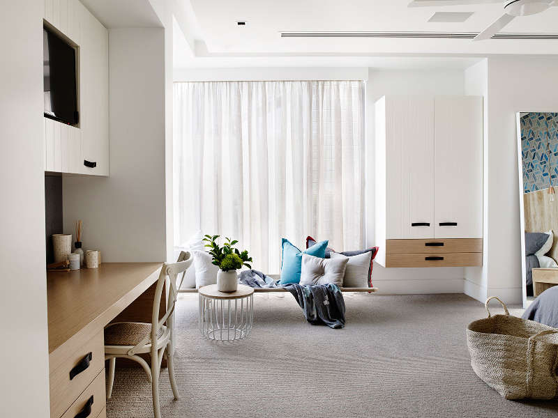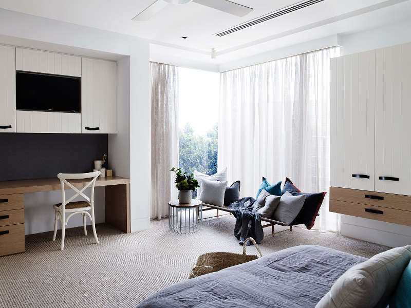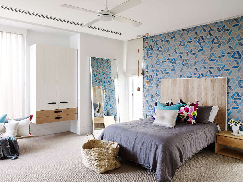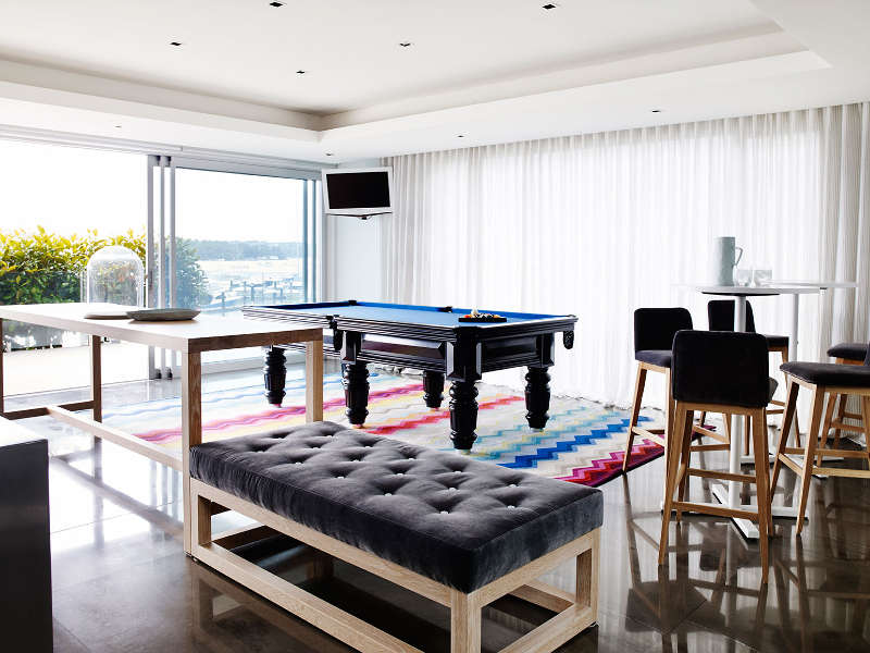 Sometimes a spectacular view can all but overwhelm any attempt to decorate a room. Either the room pales in comparison or the view and the room fight each other to the death. Definitely not the case in this harbourside home in Sydney by EB Interiors. A palette of moody blues, an emphasis on strong contemporary lines and bespoke joinery provide the stage for the subtle textures and pops of colour from soft furnishings and wallpaper.