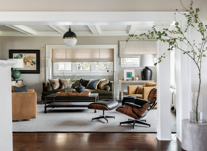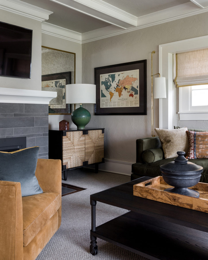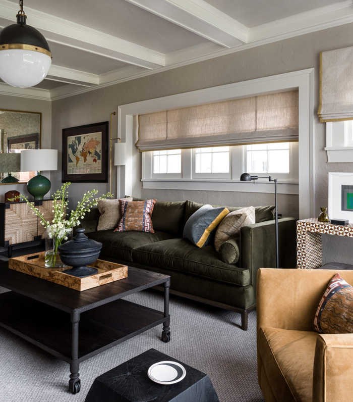 Seattle-based interior designer Brian Paquette continues to make me swoon over his work – including this magazine-worthy living and dining room he designed in West Seattle. Such beautiful tones of deep green, ochre, black and grey. Moody and dramatic without being too dark.