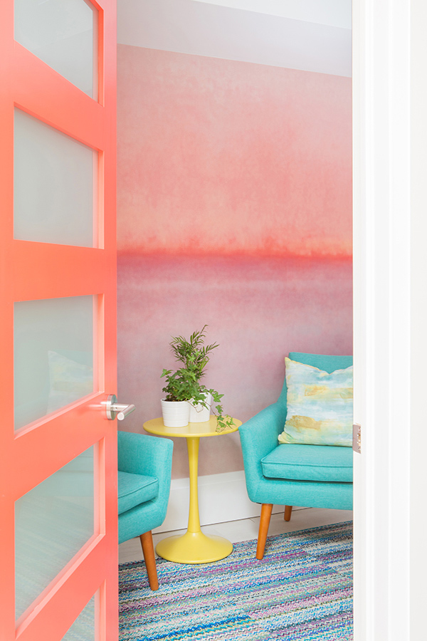 Beautiful! So great to see color. The colors in the second pic really speak to me: tangerine and mint with a shot of yellow! Yum. I want this color scheme in my new apartment. Of course, I would add a hot pink lamp.