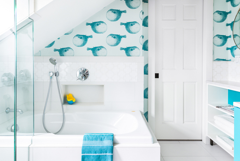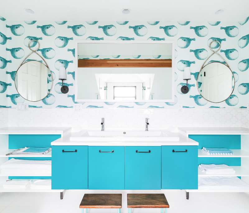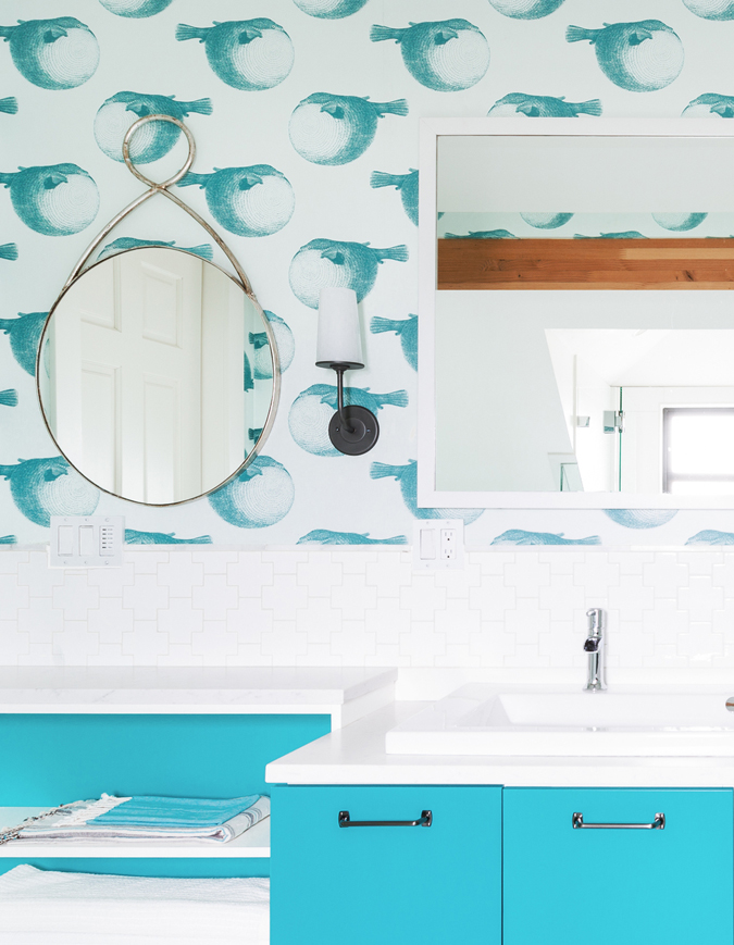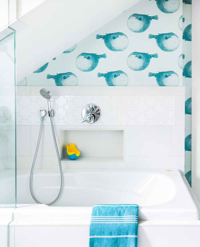 Do your kids hate taking a bath or brushing their teeth? Bet they’d be alot more excited about both of those tasks if they were able to do it in this cool bathroom! The “Mr. Blow” wallpaper by Abnormals Anonymous is so fun!!! By Brio Interior Design (photos: Haris Kenjar).