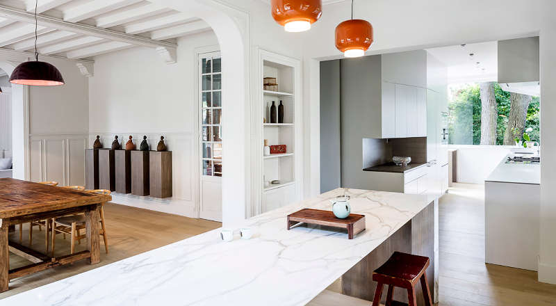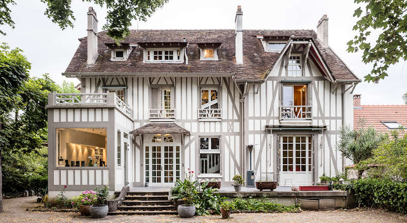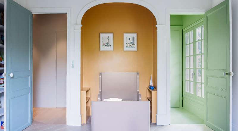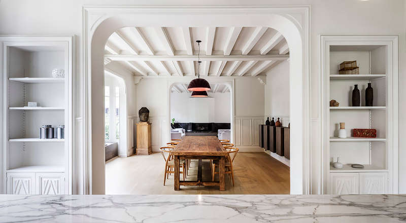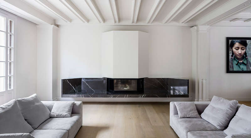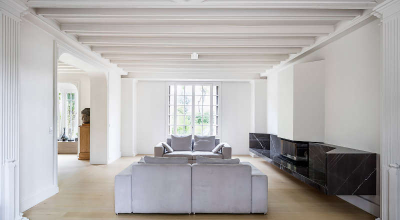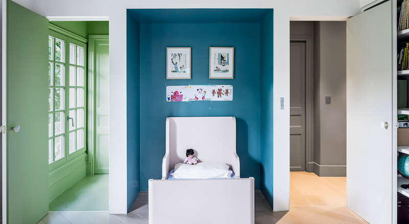 It is as if an exquisitely restrained, minimalist interior has been inserted into a 19th century timbered house. Colour is used sparingly and when it is, coloured blocked “boxes” contain the new. The stark contrast between old and new heightens the impact of both. Maison à Colombages by 05AM Arquitectura.