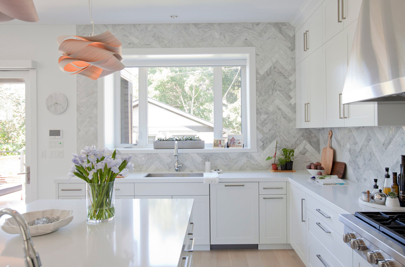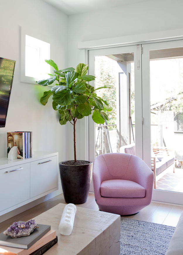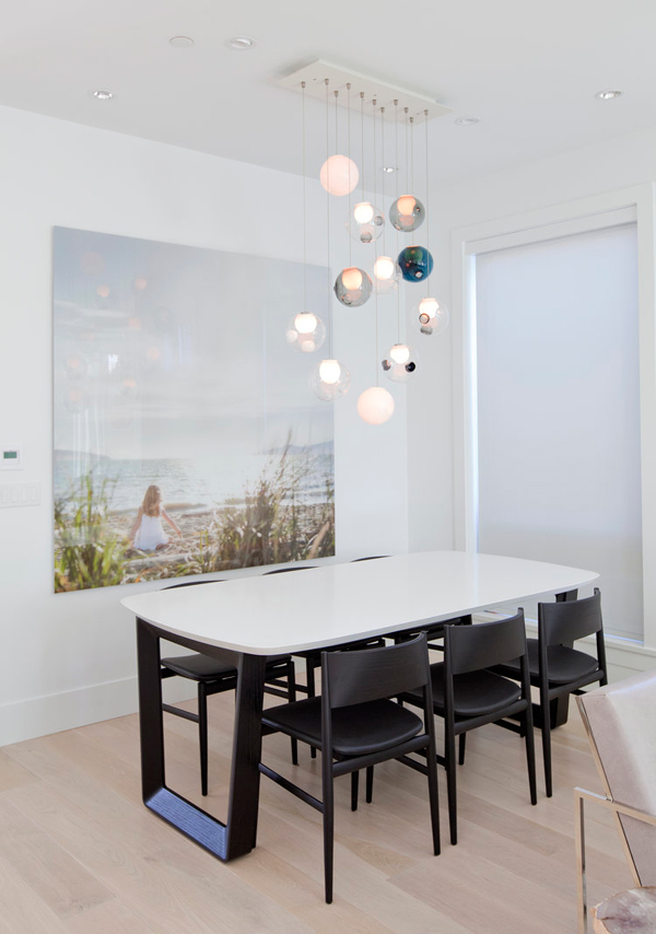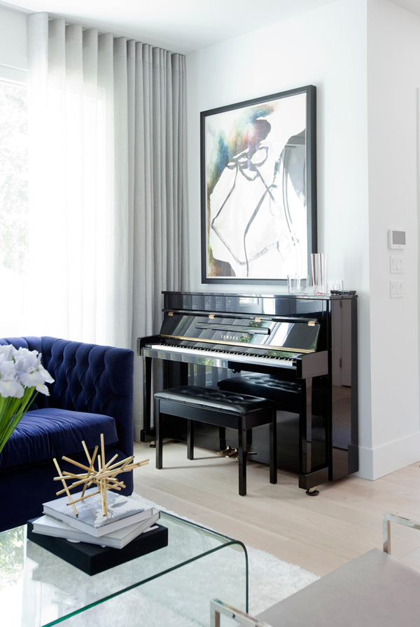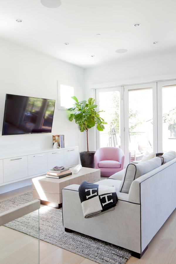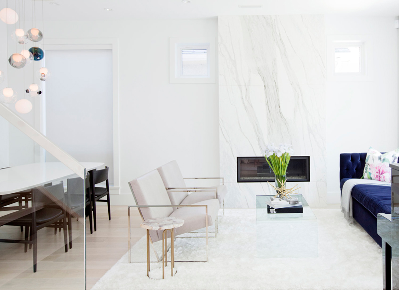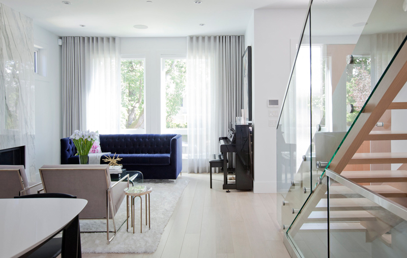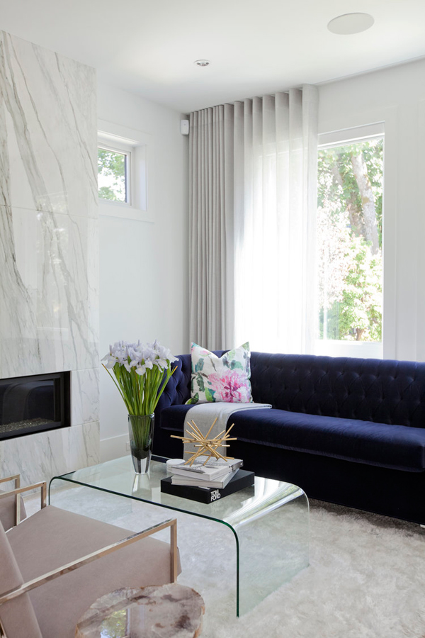 What a beautiful house this is!!! Modern and minimalist in architectural details, and so open and bright. Loving the drama the dark blue velvet sofa adds to the front sitting room and the pink club chair to the TV room. Fabulous style by Vancouver-based Angela Robinson.